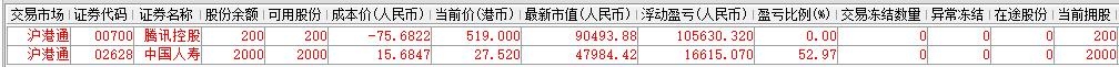 | 账户初始资金:100000.00元 2015年5月18日入金:32000.00元 2015年5月29日入金:9000.00元 2015年6月23日入金:20000.00元 2015年6月26日入金:10000.00元 2015年6月29日入金:20000.00元 2015年7月3日入金:20000.00元 2015年7月8日入金:10000.00元 2016年1月12日入金:90000.00元 2016年1月22日入金:100000.00元 2016年1月27日入金:100000.00元 2016年3月21日出金:270000.00元 2016年4月12日出金:35639.23元 2016年0月10日出金:56913.08元 2016年10月28日入金:60000.00元 2017年3月7日出金:113800.00元 参考市值:159748.30元 账户资产:160214.34元 截至今日账户A股盈亏:-41284.19元 截至今日账户港股盈亏:117177.97元 账户净值:1.793 资金股份