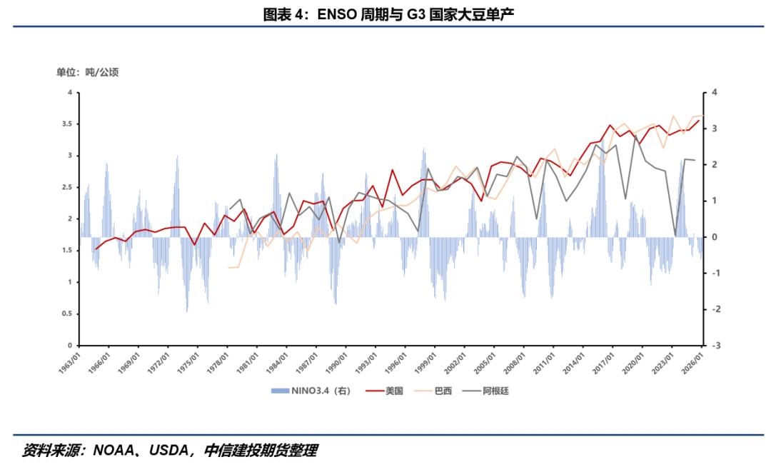 对于美国大豆,夏季厄尔尼诺的影响通常相对间接,难以简单对应“必然增产”或“必然减产”,主要因ENSO对美国中西部夏季气温和降水的直接影响弱于冬季,因此对美国玉米和大豆单产并不具有很强的稳定预测力。尽管如此,历史上厄尔尼诺年份常提高美国生长季出现“春季偏干、夏季不过度炎热且降水相对正常”的概率:前者有利于播种推进,后者则有助于开花、结荚和鼓粒,因此美豆更容易获得正常至偏好的天气环境。但若播种期过湿、局部洪涝,或8月后段再度转为干热,这种潜在利好仍会被削弱。 对于南美大豆,厄尔尼诺的影响则更具结构性。巴西常呈现“南部偏湿、中北部阶段性偏干”的分化格局:南部如南里奥格兰德州、帕拉纳州降水改善,通常有利于大豆生长;但中西部及部分中北部产区若在播种和生长期遭遇少雨高温,可能导致单产承压。阿根廷方面,厄尔尼诺通常意味着降水高于常年,这对潘帕斯农业区的大豆单产影响整体偏乐观,尤其有助于缓解开花结荚和鼓粒期的水分胁迫;但若降水过于集中,也可能带来积水、病害以及收割延迟。整体来看,厄尔尼诺对美豆影响偏温和,对巴西体现为南北分化,对阿根廷则总体偏产量增长。