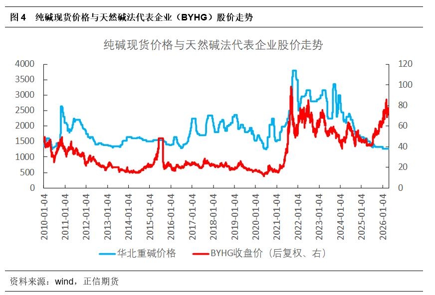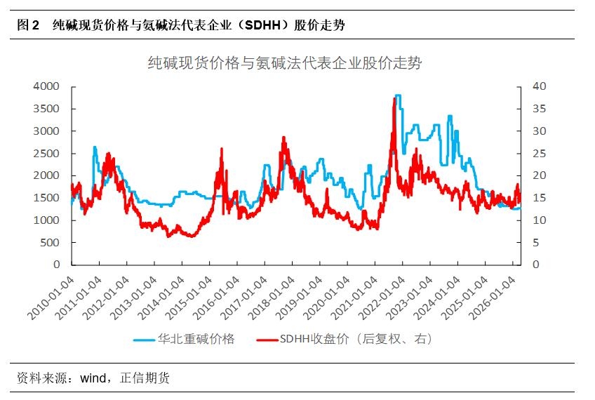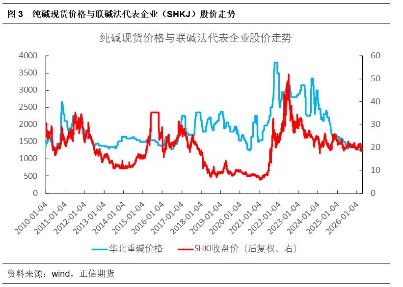 三、不同工艺纯碱公司与价格走势有所区别 多数能跨越周期存活的化工公司基本具有以下几个优势:其一,行业壁垒(即技术优势),部分化工品由于工艺技术难度能够阻止其他企业进入,垄断优势下需求端不出现极端情况,这类型企业基本可以成为周期股中的成长股,类似于MDI/TDI中的万华。其二,规模优势,通常是扩大规模占据市场份额,具有客户粘性之后在产品定价以及公司现金流方面更加具有优势,更能抵御周期低谷,多数细分化工行业未来都会走这类型道路,行业集中度越发明显。其三,成本优势,多数是由于原材料便宜,行业低谷时能从容应对,部分企业也采取上下游一体化发展,类似PTA中的恒力等。纯碱属于基础化工产品,如今的生产工艺相应较为成熟,各厂家产品性能差异有限,那么规模以及生产成本控制就成为影响各公司业绩的主要因素。 在纯碱生产成本中,需要考虑原料来源以及工艺流程差别,这也导致同为上市公司,但其股价走势有区别,国内目前纯碱生产包括3种工艺:氨碱法/联碱法/天然碱法,其中天然碱法成本显著低于氨碱法/联碱法,但天然碱法受限于原材料依赖性等因素,具有较为明显的地缘资源属性,联碱法企业则因有副产品氯化铵,其价格变动可能影响到公司盈利预期。上市公司中如位于西北的氨碱法厂家,煤炭等原料价格低廉同时具有规模优势;沿海某厂家虽然成本相对高一点,但具有一定规模优势及运输成本优势;而兼具成本及规模优势最明显的则是内蒙某天然碱厂家,由于新增产能落地,其在2025年四季度至今股价走出了板块独立行情。 从成本端传导来看,当纯碱期货价格上涨时,市场预期企业未来销量不变的情况下,销售收入和净利润将同步提升,尤其是天然碱法企业,成本优势显著,期货价格上涨带来的盈利弹性更大;反之,期货价格下跌则会压制企业盈利预期,导致股价承压。如2025年四季度至今,纯碱期货价格延续下跌态势,西北某氨碱法企业净利润同比大幅下降,山东某氨碱法企业业绩预亏,但内蒙某天然碱法的企业仍能保持较高盈利。 下面选取了3家主营产品为纯碱的上市公司,由于纯碱期货上市时间至今尚未达到一个完成了商品,因此选取的是2010年至今纯碱现货价格以及上市公司收盘价,样本公司中氨碱法企业和天然碱法企业股价与现货价格相关性均在0.5左右,联碱法企业相关性在0.4左右,但在纯碱价格趋势波动阶段(上涨或者下跌明显趋势时),个股表现与价格相关性较强。
