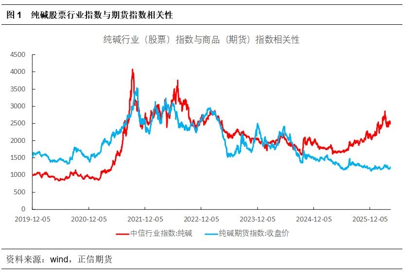 | 纯碱作为基础化工行业的代表性品种,其股票与期货价格的联动性体现了化工行业“产业基本面→资本市场→产业基本面”的闭环传导逻辑,二者走势相同一般出现在行业供需趋势明确、成本传导顺畅、政策预期一致的情况下;而走势背离则可能源于短期资金炒作、个股自身因素、宏观情绪分化等,需区分短期扰动与长期趋势,避免单纯依靠一方走势判断另一方走势。 一、纯碱股期联动传导路径 化工属于周期性行业,其产品价格受供需、成本、政策等多重因素影响,波动频繁且幅度较大,股票与期货作为资本市场中对接化工行业的两大核心工具,二者之间存在较为紧密的联动关系。对于周期性行业而言,商品涨价/跌价多数时间能带来该行业公司盈利改善/下滑预期,进而推高/降低公司股价预期;同时股价涨跌也是对公司未来盈利预期的表现,进而可能影响到市场对其主营产品价格的预期。 以纯碱行业为例,股票与期货的联动本质是“产业基本面→期货价格→股票价格”与“市场预期→股票价格→期货价格”的双向传导,二者相互影响、相互印证,核心传导路径围绕成本、盈利、预期三大维度展开,且期货价格对股价的指导意义通常优于现货价格。 纯碱期货价格向股票价格的传导路径:纯碱期货价格作为行业价格趋势的“风向标”,其波动通过盈利预期传导至上市公司股价。其一,成本与盈利直接传导,纯碱期货价格反映市场对未来现货价格预期,而现货价格决定纯碱生产企业的销售收入与毛利率,纯碱核心原材料煤炭价格波动会直接推高生产成本,进而影响期货价格走势,而期货价格的涨跌会快速映射到企业盈利预期中,如2021年初纯碱期货价格快于相关个股上涨,随后股期联动上涨。其二,行业供需预期传导,纯碱期货价格波动往往源于行业供需格局变化,而期货市场价格提前释放,进而会影响股票市场对纯碱企业的估值定价,如当行业出现产能检修、落后产能退出等供给收缩情况时,纯碱期货价格会率先上涨,股票市场预期企业产品议价能力增强,进而推动股价上涨。 纯碱股票价格向期货价格的传导路径:股票价格波动反映市场对纯碱企业长期发展的预期,这种预期会间接影响期货市场的资金流向和情绪,该路径多出现于行业趋势转折或重大政策出台阶段。其一,企业层面的预期传导,纯碱上市公司的业绩公告、产能扩张计划等信息,会影响股票价格,进而传递出行业未来的供需变化预期,如某纯碱龙头企业宣布新增产能落地,部分相关股票价格因市场担忧供给过剩而下跌,这种预期会传导至期货市场,导致期货投资者看空情绪升温,期货价格跟随下跌。其二,市场情绪与资金传导,股票市场的资金流向会影响市场整体情绪,进而传导至期货市场,如当纯碱板块股票受到资金追捧、整体上涨时,会带动市场对化工板块的关注度提升,部分资金会流入纯碱期货市场,推动期货价格上涨。此外纯碱股票价格与期货价格均反映市场预期,二者交易逻辑相似,这也使得股票价格的波动能够快速传导至期货市场,尤其在底部和顶部阶段,纯碱股票价格可能会领先于期货价格变化,如在2021年四季度纯碱个股先于期货下行。 二、纯碱股票与期货走势相同/不同的具体情况分析 以纯碱期货上市以来数据为样本,其与纯碱股票行业指数相关在0.65,两者存在较强的正相关性。其中在2019年底至2023年初,纯碱股票指数与期货指数相关性较强;2023年期货存在较大涨跌波动,但股票下行;2024年至2025年6月,股期走势基本类似;2025年7月至今,期货延续下跌,但股票指数却有上行。 当行业处于“供需格局清晰、成本驱动明确、政策预期一致”的状态时,纯碱股票与期货价格基本会呈现同步走势,具体可分为:(一)行业供需格局出现明确趋势性变化时。无论是供给端的收缩还是需求端的爆发,只要形成明确的趋势,纯碱股票与期货价格都会同步响应上涨,比如是在2021年双碳政策下,股票和期货同步上涨;而当新产能集中投放、需求疲软导致供需失衡时,期货价格先行下跌,股票市场会下调企业估值,股价随之下行,比如在2023年-2024年新增产能集中投放,导致纯碱价格重心震荡下移,期货与股票价格同步走弱(虽然期货出现阶段反弹,但年度重心下移)。(二)成本端出现大幅波动且传导顺畅时。当煤炭等核心原材料价格出现大幅波动时,会直接传导至纯碱期货价格,进而影响股票价格,形成同步走势。这种同步走势的核心前提是成本传导顺畅,即纯碱企业能够将成本波动顺利转嫁至产品价格,此时期货价格与股价的联动性最强,比如在2021年前三季度纯碱股票和期货均有大幅上涨,四季度煤炭回落,纯碱跟随回落。(三)宏观政策或行业政策出现重大利好/利空时,宏观政策(如货币政策、财政政策)和行业政策(如供给侧改革、产能调控、出口政策)的重大调整,会同时影响纯碱期货和股票市场,导致二者走势同步。 尽管纯碱股票与期货价格整体联动性较强,但在“预期分歧、短期扰动、企业个股差异”等场景下,二者走势会出现背离,即一方上涨、一方下跌,或涨跌幅度差异显著,具体可分为:(一)期货市场短期资金炒作,脱离产业基本面时。由于纯碱期货短期易出现资金炒作导致期货价格波动脱离产业基本面,而股票价格更注重企业长期盈利预期,因此可能形成“期货涨、股票跌”的背离格局,尤其是在2023年表现明显,期货短期出现大幅上涨