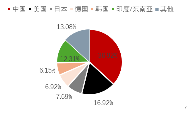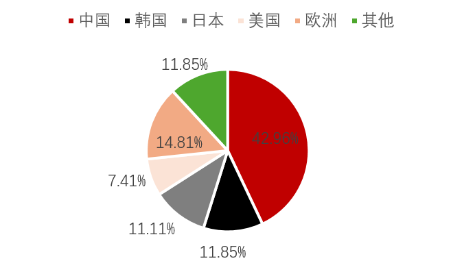 | 全球丁二烯的生产以碳四抽提法为主,产量约占95%,辅以丁烯/丁烷脱氢法。C4主要是乙烯裂解过程中伴生出来的产物,因此,丁二烯的供应跟其自身的生产利润几乎不相关,而跟乙烯裂解的开工和利润息息相关。 全球丁二烯的产量分布比例来看,主要集中在亚洲,其中中国和韩国以及日本的总产量占比超过全球产量的一半,剩余的丁二烯产量主要集中在欧洲和美国。我国同时也是丁二烯的主要消费国,随着近年来我国丁二烯产能的扩张,丁二烯进口依赖度呈现下降走势,目前已经下降到10%以下。目前我国丁二烯年进口量约35-40万吨,出口量约10-15万吨,净进口量20万吨左右,其中45%的进口来自韩国,25%来自中东,15%来自日本。我国丁二烯的出口去向为韩国(70%)和东南亚(30%)。 图 1:全球丁二烯产量分布丨单位:%