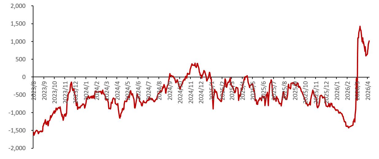 数据来源:隆众资讯 华泰期货研究院 伊朗冲突爆发以来,我国丁二烯的产量基本跟随石脑油制乙烯产量的变化节奏,但看到有大约一周的传导时间,乙烯在3月5日当周就开始出现了产量及开工率的环比下降,而丁二烯在3月5日当周,产量和开工率还呈现了环比回升。滞后了一周之后,才跟随乙烯开始出现持续的环比下降走势,近期两者呈现出了一致的变化。 上文提到,丁二烯主要是乙烯裂解的伴生品,因此,我们看到的是丁二烯的产量跟其自身的生产利润之间的关系,变成了产量主导利润的模式,由此带来两者是负相关的关系。也就是当丁二烯的产量较为充裕时,更多反映的是其对于价格的压制明显,体现在生产利润的下行。反之,丁二烯产量少时,对应的是其生产利润的回升。而丁二烯的开工率跟生产利润之间则并不存在正相关的关系。 对国内丁二烯供应的影响,还有部分来自净进口的波动,主要通过进出口利润来调节。从上文我们知道,目前我国丁二烯年进口量约45%的来自韩国,25%来自中东,15%来自日本。我国丁二烯的出口去向为韩国(70%)和东南亚(30%)。今年因伊朗冲突事件,导致韩国丁二烯装置停产和降负荷较为明显,一度使得国内丁二烯进口窗口关闭,出口窗口打开,刺激了我国丁二烯阶段性去往韩国出口量的增加。进口量的减少叠加出口量的回升,我国丁二烯港口库存出现高位回落,进一步缓解了国内丁二烯供应压力。这也是推动3月份丁二烯价格上涨的主要因素之一。 责任编辑:七禾小编 |