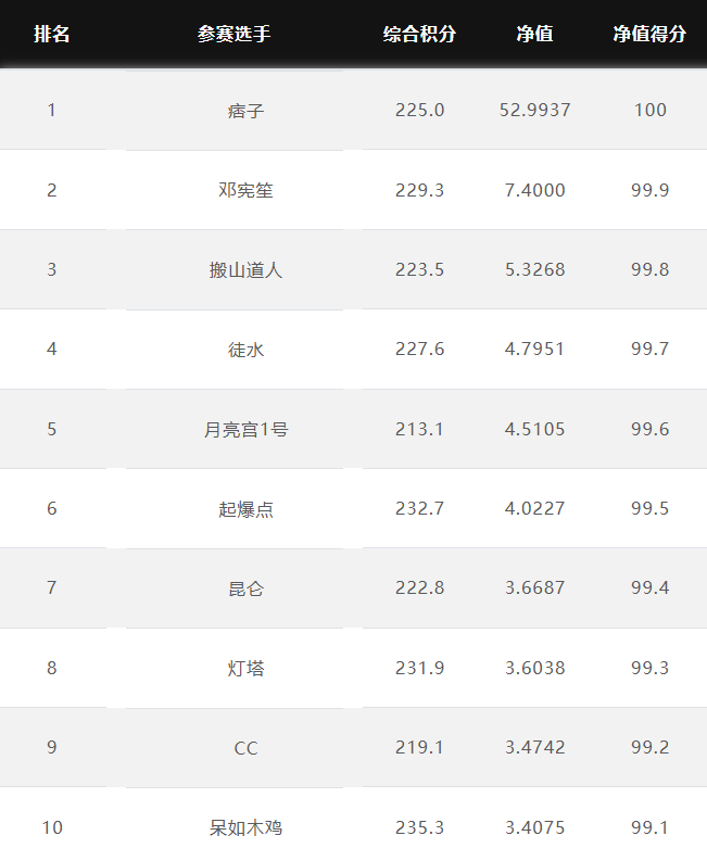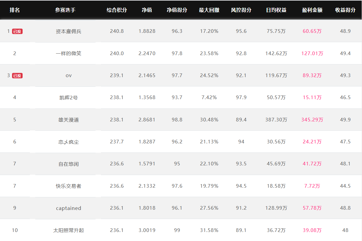 奖金上不封顶 特定期货公司参赛奖金翻倍 优秀选投 每周选优秀选手对接资金 达标必投 单笔最多给1个亿管理型资金 管理型资金盈利分成20%~70% 免费培训/研报/调研/咨询 诚邀您参赛! 为了促进国内期货市场交易人才的发展和成熟,七禾网举办本次“期货CTA英雄联盟”实盘大赛&超级服务,招募优秀的操盘手,为优秀的交易人才搭建桥梁! 第四届大赛圆满结束,第五届荣耀开启,欢迎参赛!第五届大赛已于2025年7月1日开赛,火热报名中,比赛过程中持续接受报名,大赛奖金&管理型资金&超级服务,等你来领! 2023年2月16日后,在主办方指定的几家期货公司中的某一家C公司新开户参赛,享奖金翻倍! 在主办方指定的几家期货公司中的某一家B公司新开户参赛,享奖金翻倍! 大赛中的优秀选手,只要在大赛中有3个月及以上的实盘业绩,主办方将每周发送优秀参赛者的业绩、资料给合作的数十家资方,供其考察是否投管理型资金。至2022年8月12日,资方已选出23名优秀投顾,累计投入超5.5亿元管理型资金。 优秀选投:通过主办方及资方考核后,将获得管理型资金(资金来源:七禾网自有资金(买优秀选手的基金产品)、七禾网股东、数十家合作资方) 在主办方指定的几家期货公司中的某一家B公司新开户参赛,以及2023年2月16日后,在主办方指定的几家期货公司中的某一家C公司新开户参赛,可以按照:“达标必投”进行考核(将给予单笔100万元~1亿元的管理型资金,分红比例20%~70%),详细规则请联系微信:15858201632 大赛综合排名前10名 2026.4.21