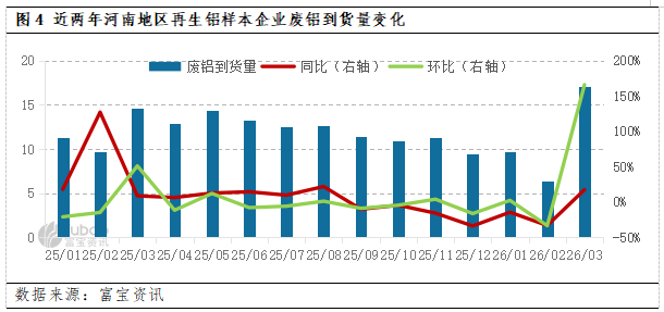 生产方面,3月河南地区再生铝样本企业整体产能利用率及总产量环比2月大幅增长的主要原因有四,一是2月春节假期影响,多数企业停工停产,仅少数大厂维持生产,导致对比基数较低;二是节后企业全面复工复产,拉升产能利用率及产量;三是进入传统旺季,来自下游订单复苏的加持;四是中东局势影响国际物流运输,从而限制进出口贸易量。与去年同比样本企业产能利用率及总产量仍呈现下滑趋势,主因有三:一是再生铝行业发展迅速产能扩张明显,但产品缺乏多样性,出现结构性产能过剩;二是地区特性受环保管控限制产能释放;三是政策变化促进市场良性发展的过程中,部分不符合要求规范的中小企业生存艰难,被迫出现暂时性停产。