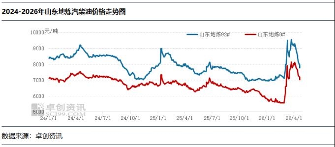| [导语] 受国际原油成本下行以及终端需求疲软双重压制,叠加高库存利空共振,汽柴油价格阶段性回落,原油成本刚性传导走弱,尽管期间震荡上涨但是仍难阻止本轮汽柴油跌势,国内汽油主流价格或将跌向7500元/吨附近关口,柴油0#主流价格跌穿7000元关口后或将仍有下滑空间。 近期汽柴油价格处于下行态势,油价冲高后不断回落,在3月23日成品油零售价格调价窗口确认后,山东地炼汽柴油价格短暂触及最高批发限价,随后下游恐高心态增浓,逢高入市情绪普遍降温,终端加油站以及户外用油单位开始进入消化库存阶段,投机性需求基本停滞,供需面开始成为影响油价走势的主导驱动。 1. 供需失衡压力扩大 汽柴油销售节奏缓慢 尽管3月下旬至4月上旬原油成本再度上涨,但是成本传导性弱化,成本端支撑有限。供应方面4月部分主营炼厂降负,但是山东地炼资源供应较为稳定,市场供应并未出现明显降量,且受高价以及需求疲软影响,主营库存维持高位水平,汽油库存接近去年高点,柴油库存触及年内高位,4月份月度销售欠量较高,后期追赶进度意愿增强,炼厂方面处于累库存阶段,短期库存去化压力较大。 终端需求表现持续疲软,下游买涨不买跌心态较为浓厚。清明假期后随着自驾出行范围减少,且零售高油价抑制部分通勤自驾出行,汽油消费萎缩,导致加油站零售量同比下滑幅度在20-30%左右,柴油刚需回升企稳为主,物流运输缺乏进一步的增量,供需面利空驱动占据主导,汽柴油仍难以阻止阶段性下行趋势,当前市场回吐此前风险溢价,引发贸易商获利了结,除空头回补外业者风险偏好情绪较浓。随着油价持续走低,下游终端用户入市心态谨慎,刚需采购节奏缓慢,小单按需补货为主,逢低短时出货好转但是缺乏持续性,地炼船运大单成交疲软,导致汽柴油价格重心走低,利空车单价格。 原油仍处于高位,但是汽柴油价格持续下跌,结构性行情分化较为明显。此外4月成品油出口较少,对缓解国内供需矛盾作用有限。3月汽油出口同比下降67.95%,柴油同比下降5.17%。