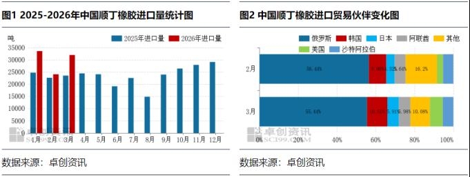 | 【导语】3月份中国顺丁橡胶进出口量均出现一定上涨,同环比涨幅均在30%以上。本文主要分析3月进出口量发生的变化以及变化背后的原因。 3月顺丁橡胶进口量宽幅上涨 据中华人民共和国海关总署公布数据显示,2026年3月顺丁橡胶进口32000.35吨,环比涨32.75%,同比跌35.98%。2026年1-3月进口总量约89690.43吨,累计同比涨26.48%。2026年3月,中国轮胎生产积极性较2月份明显回升,且受欧盟订单抢出口影响,3月整体开工以及产量同比提升。另外中东美伊争端自2月底爆发,3月份处于白热化阶段,全球能源及化工品价格上涨,中国下游生产企业积极备货以应对未来成本上涨带来的财务风险以及供应风险。另外,3月中旬开始,国内顺丁纷纷降负生产,为保证订单生产,且部分进口货源存在价格优势,因此3月份进口量同环比走高超30%。据卓创资讯监测半钢轮胎生产企业统计数据显示,2026年3月中国半钢轮胎总产量为6271.66万条,同比上升0.74%,环比上升69.86%。2026年3月中国的全钢轮胎总产量为1370.56万条,同比走高5.62%,环比走高64.45%。