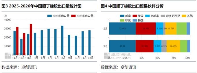 进口贸易伙伴变化有限。根据2026年3月进口贸易伙伴来看,进口自俄罗斯、韩国、美国的顺丁橡胶总量排名在前三位。其中,俄罗斯仍然领先,自俄罗斯进口顺丁橡胶约17740.62吨,同比增长36.76%,占进口总量的55.44%。其次是韩国,自韩国进口顺丁橡胶约3364.52吨,同比下滑6.66%,占进口总量的10.51%。美国跃居第三位,自美国进口顺丁橡胶约2109.17吨,同比走高889.24%,占进口总量的6.59%。进口自俄罗斯的量明显增长,进口自美国、阿联酋的顺丁橡胶数量明显上涨。主要源于部分货源存在价格优势。 出口量创新高 据中华人民共和国海关总署公布数据显示,2026年3月顺丁橡胶出口35157.25吨,环比涨41.22%,同比涨47.41%创两年以来单月出口新高。2026年1-3月出口总量约91938.93吨,同比涨31.76%。根据2025年3月出口贸易伙伴来看,出口贸易伙伴中排名前三位的是越南、泰国、柬埔寨。其中,出口到越南的货源总量在11567.68吨,占比达32.9%附近。出口到泰国的货源总量在7756.28吨,占比达22.06%附近。出口到柬埔寨的货源总量在3414.47吨,占比达9.71%附近。出口至柬埔寨国家的量稳定增长,这主要依赖于柬埔寨当地轮胎厂的投产。