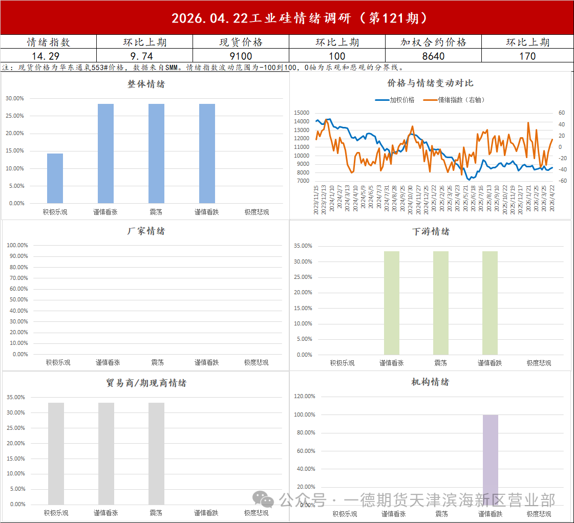 | 报告品种:工业硅 原文链接:https://mp.weixin.qq.com/s/k4QwkVfedtk1PPH4EAVxHg 根据样本统计,本期情绪指数为14.29,较上期回升9.74,样本参与者情绪有转好,整体对未来一周偏向谨慎乐观。近期盘面有所反弹,但现货反应不大,且盘面价格仍在震荡区间运行,虽受多晶硅盘面带动而有所偏强,但驱动力不足,暂无趋势性行情。