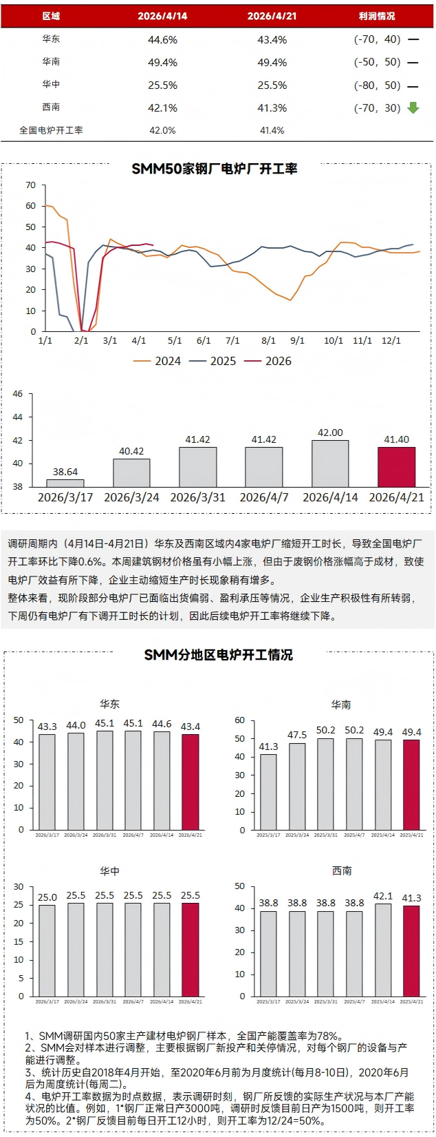 | 报告品种:螺纹钢 原文链接:https://mp.weixin.qq.com/s/GoMY4IRNgkXxwc1n4mTD1Q 截至4月21日,全国50家主产建材的电炉钢厂开工率为41.4%,环比上期下降0.6%;产能利用率42.5%,环比上期下降0.3%;建材日均产量9.47万吨,环比上期下降0.07万吨。 调研周期内(4月14日-4月21日)华东及西南区域内4家电炉厂缩短开工时长,导致全国电炉厂开工率环比下降0.6%。本周建筑钢材价格虽有小幅上涨,但由于废钢价格涨幅高于成材,致使电炉厂效益有所下降,企业主动缩短生产时长现象稍有增多。 整体来看,现阶段部分电炉厂已面临出货偏弱、盈利承压等情况,企业生产积极性有所转弱,下周仍有电炉厂有下调开工时长的计划,因此后续电炉开工率将继续下降。