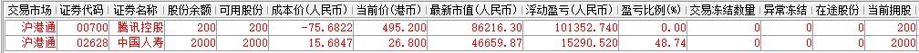 | 账户初始资金:100000.00元 2015年5月18日入金:32000.00元 2015年5月29日入金:9000.00元 2015年6月23日入金:20000.00元 2015年6月26日入金:10000.00元 2015年6月29日入金:20000.00元 2015年7月3日入金:20000.00元 2015年7月8日入金:10000.00元 2016年1月12日入金:90000.00元 2016年1月22日入金:100000.00元 2016年1月27日入金:100000.00元 2016年3月21日出金:270000.00元 2016年4月12日出金:35639.23元 2016年0月10日出金:56913.08元 2016年10月28日入金:60000.00元 2017年3月7日出金:113800.00元 参考市值:154160.17元 账户资产:154626.15元 截至今日账户A股盈亏:-41270.19元 截至今日账户港股盈亏:111575.84元 账户净值:1.731 资金股份