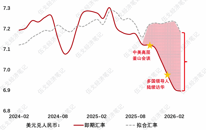 来源:WIND,Bloomberg,笔者测算 注:纵轴为盈利、利率对美科技企业市值的贡献(较战前预期差值)。 四、汇率在回归? 近期人民币的“超预期”升值难以用传统经济基本面来完全解释,或折射出美国已成为现有国际秩序的“解构者”,中国则是相对的“稳定器”。 图4. 汇率难用传统基本面来解释