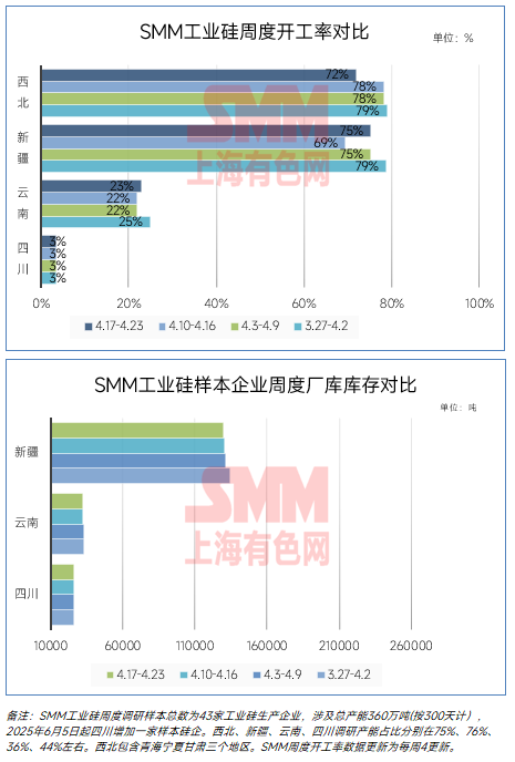 | 报告品种:工业硅 原文链接:https://mp.weixin.qq.com/s/_8QN5XyKp5yCt7jFw4NZgQ?scene=1&click_id=4 4月17日至4月23日: 新疆地区样本硅企周度产量在36450吨,周度开工率在75%,周环比增加。周内新疆样本硅企产量增加,主因少量硅炉复产带动周内开工率上行。下周开工率预期持稳为主。近期工业硅期货价格走势震荡,周初Si2609合约偏强最高点触及8750元/吨,北方部分硅企对期现商套保出货量增多。现货方面下游用户采购压价或观望情绪偏强,现货价格波动幅度较小。 云南样本硅企周度产量在2650吨,周度开工率23%,较上周大体稳定。样本选取原因云南样本硅企开工率高于地区总开工率。北方市场对西南价格压制性强,4月份云南硅企维持低位开工。 四川样本硅企周度产量为390吨,周度开工率在3%。较上周持平。四川即将进入平水期,在5月底由平水期过度至丰水期,四川省内小水电用量不同不同硅企存在电价差异,预计5月份供应增量较为有限。