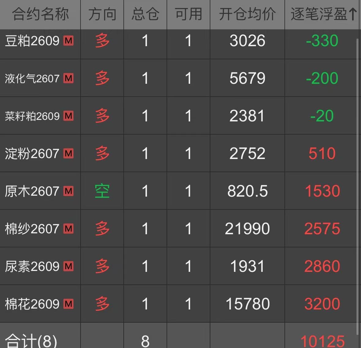 | 一、开仓总结 棉纱:2026年4月8日,达到启动点的开仓条件,所以在14:48开多一手棉纱2605合约,开仓价为21575。棉纱2605合约于2026年4月10日09:51移仓至主力合约2607,开仓价为21990。 淀粉:2026年4月9日,达到启动点的开仓条件,所以在14:44开多一手淀粉2605合约,开仓价为2760。淀粉2605合约于2026年4月15日21:14移仓至主力合约2607,开仓价为2752。 棉花:2026年4月10日,达到启动点的开仓条件,所以在14:45开多一手棉花2609合约,开仓价为15780。 尿素:2026年4月20日,达到启动点的开仓条件,所以在14:49开多一手尿素2609合约,开仓价为1931。 豆粕:2026年4月22日,达到启动点的开仓条件,所以在14:41开多一手豆粕2609合约,开仓价为3026。 原木:2026年4月23日,达到启动点的开仓条件,所以在14:54开空一手原木2607合约,开仓价为820.5。 菜粕:2026年4月23日,达到启动点的开仓条件,所以在14:59开多一手菜粕2609合约,开仓价为2381。 液化气:2026年4月27日,达到启动点的开仓条件,所以在14:56开多一手液化气2607合约,开仓价为5679。
