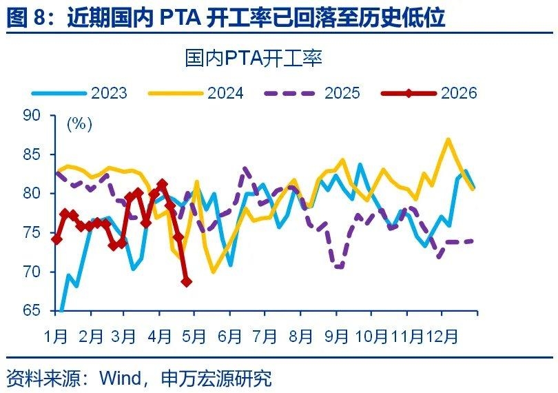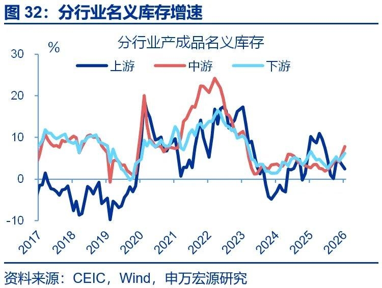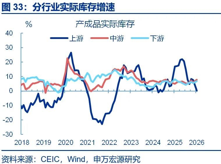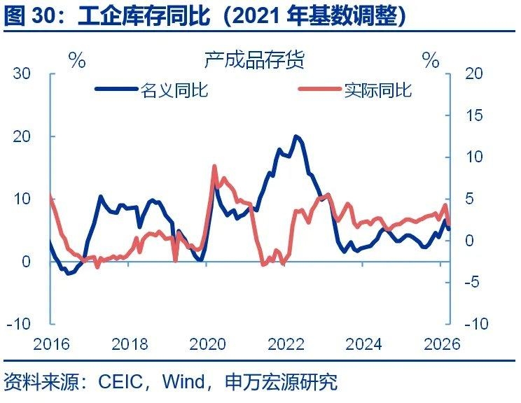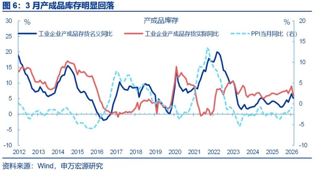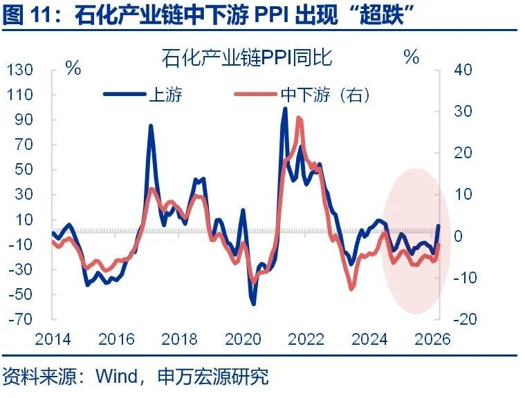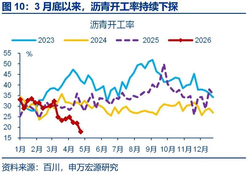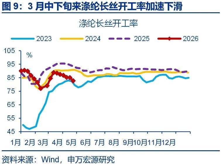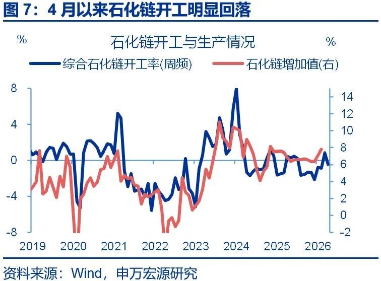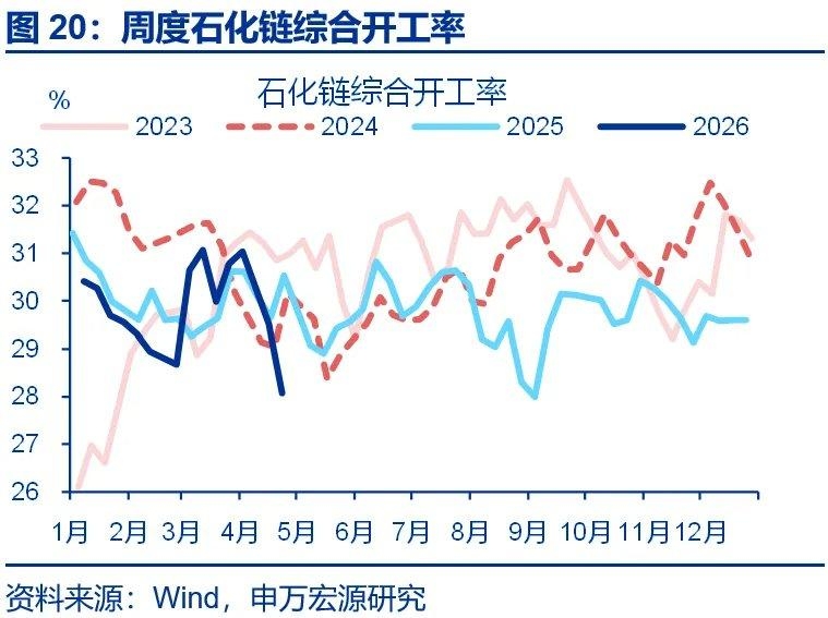 本轮油价对供给侧冲击的速度或快于以往,4月以来石化链高频生产、库存已大幅下行。虽然统计局尚未公布分行业库存数据,但3月企业名义库存回落1.4个百分点至5.2%,剔除价格因素后的企业实际库存增速也明显回落3个百分点至6.1%,库存加速消耗也预示着未来成本上升的压力;同时,我们构建的“石化产业链中下游综合开工率”指标自4月以来加速下行(同比回落1.3个百分点至-0.4%),结构上PTA、涤纶长丝、沥青等产业链上工业品的开工率均明显走弱。