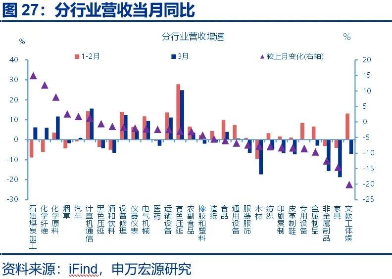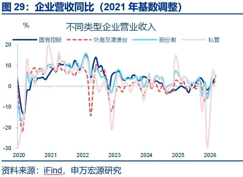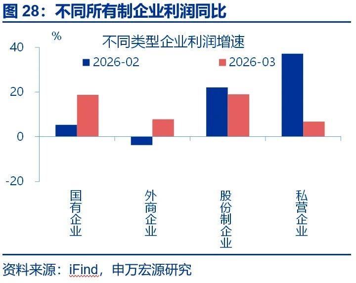 分所有制看,国有企业利润延续增长趋势,私营企业利润大幅下滑。3月,国有企业的利润增速累计同比较前月上行13.4个百分点至18.7%,而私营企业利润大幅下行30.4个百分点至6.8%。营收层面,国有企业营收继续回升,累计同比上行3.0个百分点至4.7%,但私营、股份制企业营收累计同比分别较上月回落4.5、1.1百分点至3.0%、5.3%。