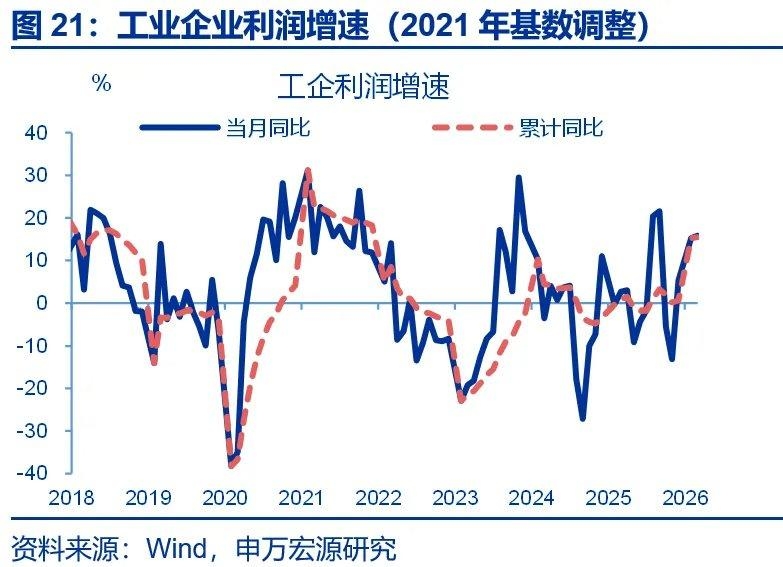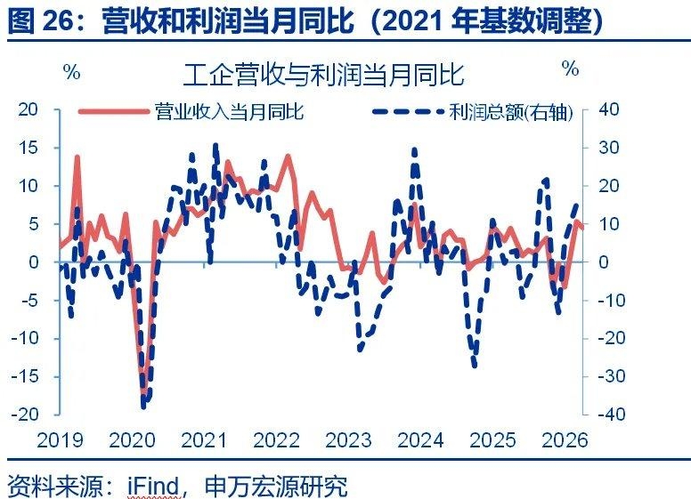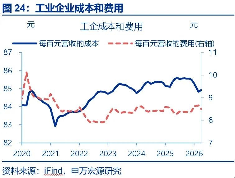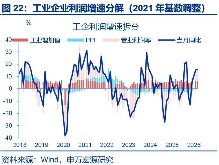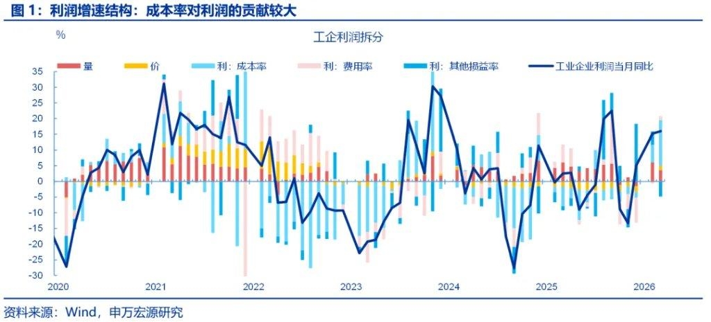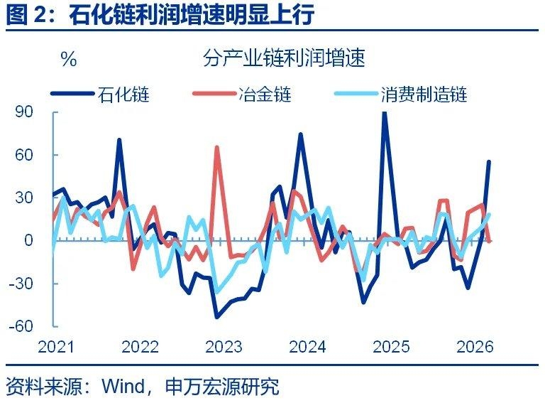 | 事件:4月27日统计局公布3月工业企业效益数据,营收累计同比5%、前值5.3%;利润累计同比15.5%、前值15.2%。3月末,产成品存货同比5.2%、前值6.6%。 1. 核心观点:利润高增并非说明油价飙升利好盈利,实则油价传导是分阶段的 3月工业利润高增,其中石化链盈利改善幅度最大,似乎显示油价飙升推升企业盈利。2026年3月,工业企业利润当月同比回升0.8个百分点至16%。结构上看,石化链盈利改善显著(回升52.2个百分点至55.2%),譬如化学纤维、化学原料、油气开采等行业利润分别回升96.6、46.3、43.7个百分点;而冶金链利润回落25.2个百分点、消费行业利润仅上行8.4个百分点。从影响因素看,石化链营收(回升5.4个百分点至4.7%)、成本率(下行2.1个百分点至83.6%)均趋改善,貌似显示中下游行业成功顺价、带动企业盈利积极修复。