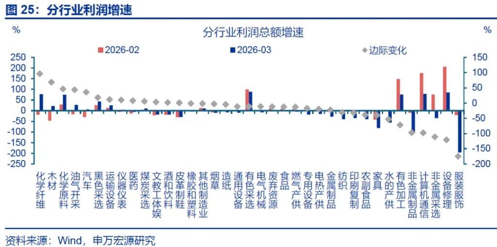 结构上,石化链相关行业利润增速回升幅度较大。3月,化学纤维、化学原料、油气开采等行业利润回升幅度最大,同比分别较前月上行96.6、46.3、43.7个百分点至77.9%、75.1%、27%