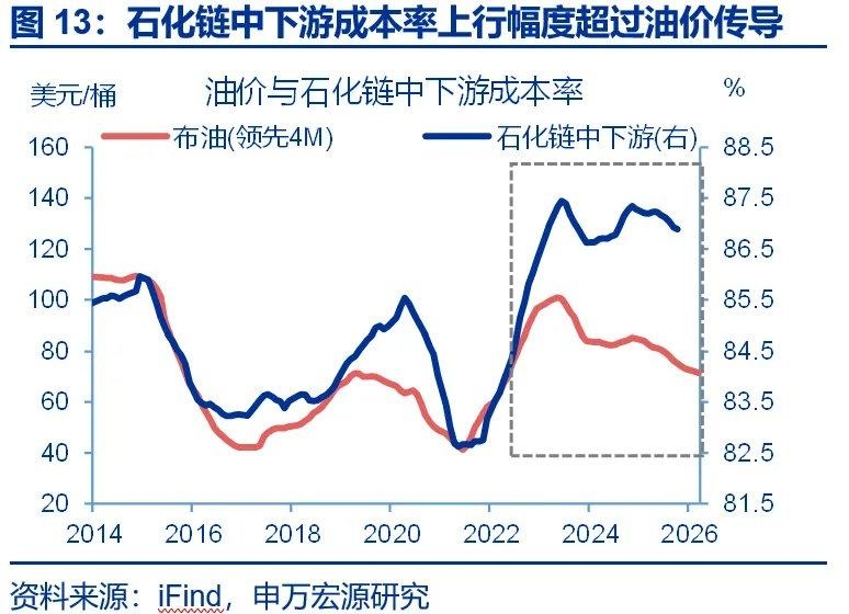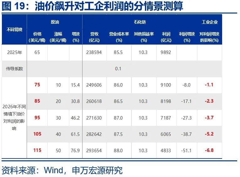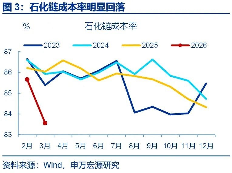 但油价对盈利的影响是分阶段的,当前盈利改善,但后续盈利或承压。在油价飙升初期,石化链PPI上涨推动营收上升、带动成本率被动下降(分母增加),同时“FIFO”制度下工业企业成本核算的仍是早期低油价时成本,库存也缓冲了高油价对当期成本的冲击,因而营收、成本压力同时改善,推升企业盈利;在油价飙升3个月后,库存消耗完毕后高油价对成本率的抬升开始显现,需求同时呈现下行压力,因而企业盈利会转而出现下行迹象。