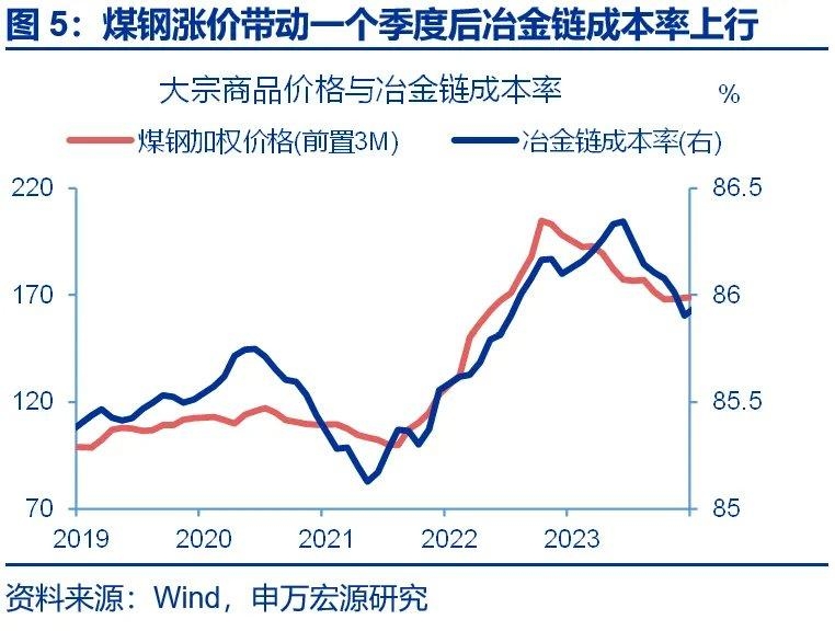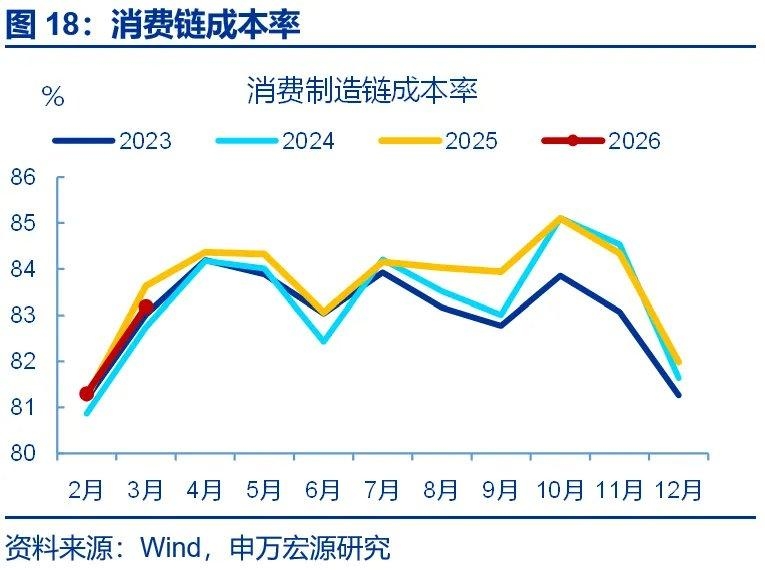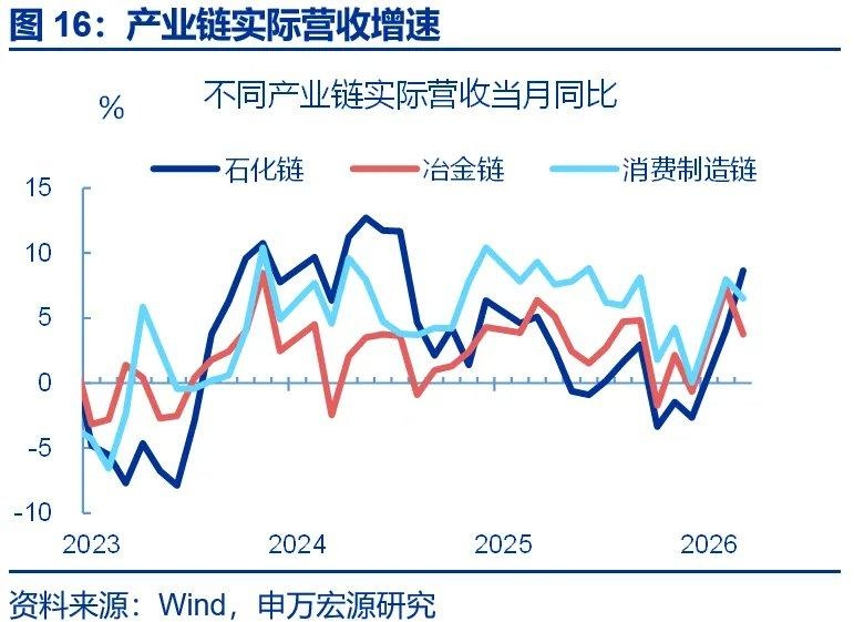 其他产业链的营收有所回落,或反映3月投资与商品消费阶段性回落的影响;同时成本压力也未有明显改善。3月,商品消费、投资增速较前月均有回落,分别下行1个百分点至1.5%,0.2个百分点至1.6%,对冶金链、消费链营收形成拖累。数据上,冶金链、消费链营收增速分别较前月回落3.3、0.9个百分点至-3.3%、-0.9%;剔除价格因素后两个产业链的实际营收增速分别较前月回落3.5、1.5个百分点至3.8%、6.5%。成本率方面,冶金链、消费链的成本率分别为87.1%、83.2%,分别持平前月、较前月上行1.9个百分点。