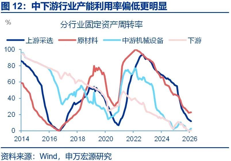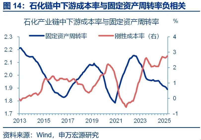 结构上,近两年产能利用率偏低导致石化链中下游面临更大的刚性成本压力,或加剧油价上行对中下游的冲击幅度。2023年以来,石化链中下游价格“超跌”的过程中,成本率涨幅已超出上游大宗价格上涨的理论传导幅度;数据上国际油价每桶上涨10美元时,中下游成本率理论上行0.5%,但实际额外增加约2%-3%。其背后或是近两年中下游投资高增导致固定资产规模膨胀,进而形成的刚性成本(固定折旧、摊销等);数据上也体现为固定资产周转率与刚性成本率高度负相关。因此本次油价飙升过程中,由于中下游产能利用率偏低,石化链中下游成本压力更高,或受到高于以往的负面影响。