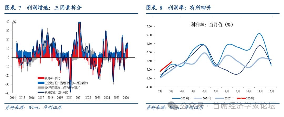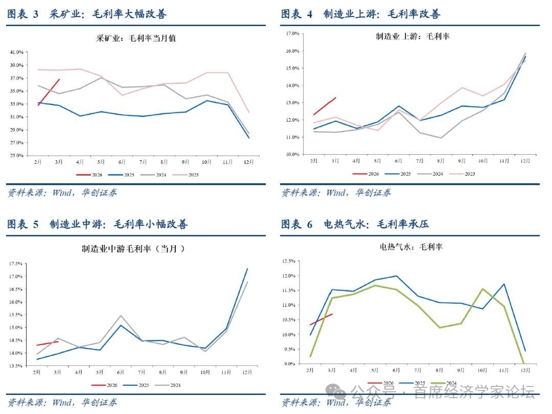 二、3月工业企业利润数据点评 1-3月,根据统计局数据,规模以上工业企业利润同比增长15.5%。3月当月同比为15.8%,好于前值15.2%。库存方面,截止至2026年3月,库存同比5.2%,前值为6.6%。分所有制看,1-3月,国有控股工业企业利润增速为10.1%,私营企业增速为25.4%,外商及港澳台为1.2%。 量、价、利润率拆分来看,量降价升。PPI同比,3月当月同比为0.5%,2月为-0.9%。工业增加值3月增速为5.7%,1-2月为6.3%;收入端3月增速为4.5%,今年1-2月为5.3%。利润率方面,3月为5.44%,去年同期(可比口径)为4.90%。利润率拆分来看,3月毛利率为14.9%,去年同期为14.2%;费用率8.23%,去年同期为8.21%;其他损益收入比为1.24%,去年同期为1.00%。 分行业来看,3月,采矿业同比为27.49%,制造业同比为19.39%,电热气水同比为-15.17%。制造业内部,3月制造业上游利润同比为34.91%,制造业中游同比为18.22%,制造业下游同比为-18.09%。 从收入端来看,3月,制造业中游收入增速为7.09%。制造业上游收入增速为6.28%,制造业下游增速为-2.61%,采矿业增速为8.72%,电热气水增速为-2.02%。