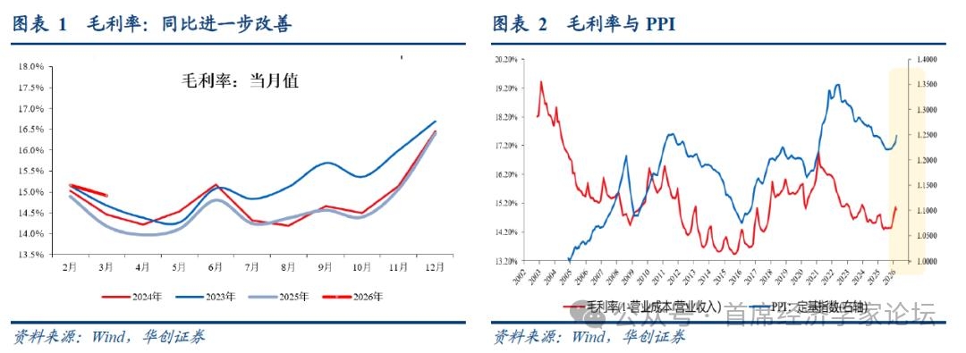 | 一、高油价冲击下的毛利率观察 (一)整体:进一步改善 3月,规模以上工业企业毛利率当月值为14.9%,去年同期为14.2%,同比改善0.7个百分点,此前1-2月,毛利率为15.2%,同比改善0.3个百分点。即,毛利率3月在进一步改善。 从毛利率与PPI的对应关系来看,本轮PPI定基指数在2025年7-9月见底,毛利率(累计值)在2025年10月见底,随后两者同步上行。参考往年经验,PPI定基指数上行初期,毛利率均会同步上行。因而,本轮毛利率改善与历史规律有相似之处。
