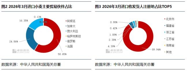 进口来源地结构变化,导致3月进口均价环比下降 进口均价方面,3月进口均价281.98美元/吨,环比跌幅3.82%,同比跌幅5.16%。截至3月底,2026年中国进口小麦累计进口均价287.69美元/吨,同比下跌9.63美元/吨,跌幅3.24%。 3月份中国进口贸易伙伴中,进口来源地出现结构性变化,低价货源占比提升。其中,阿根廷小麦受季节性收获压力影响,出口价格偏低,成为本月中国小麦进口的主要来源地,进口量占比达到58.65%,且进口均价仅270.67美元/吨,较加拿大的高价货源偏低32.34美元/吨,直接拉低3月份整体进口均价。 3月份进口贸易伙伴格局明显调整 进口贸易伙伴方面,3月份中国小麦进口贸易伙伴为阿根廷、加拿大、澳大利亚、哈萨克斯坦、俄罗斯及法国。其中,3月累计进口阿根廷小麦28.04万吨,数量占比58.65%,超越加拿大位居首位,且为近30年来首次进口;累计进口加拿大小麦11.88万吨,数量占比24.86%,较上期下降18.61个百分点;累计进口澳大利亚小麦7.82万吨,数量占比16.35%;累计进口哈萨克斯坦小麦0.06万吨,数量占比0.13%;累计进口俄罗斯小麦0.01万吨,数量占比0.01%;累计进口法国小麦50KG。 贸易方式方面,3月份小麦进口中,继续以一般贸易为主,累计进口总量47.6万吨,占总进口量的99.57%,较上期上升1.15个百分点;进料加工贸易累计总量0.20万吨,占比0.43%;本月暂无海关特殊监管区域物流货物。 收发货人注册地方面,3月份注册地位于北京市的企业累计进口总量在43.00万吨,占比89.94%,较上期下降7.81个百分点,但依然位居首位;其余福建省累计进口2.10万吨,浙江省累计进口1.14万吨,江苏省累计进口0.90万吨,海南省累计进口0.20万吨,上海市累计进口0.14万吨,河南省累计进口0.10万吨,天津市累计进口0.10万吨,广东省累计进口0.06万吨,山东省累计进口0.05万吨,新疆维吾尔自治区累计进口0.01万吨,黑龙江省累计进口50kg。