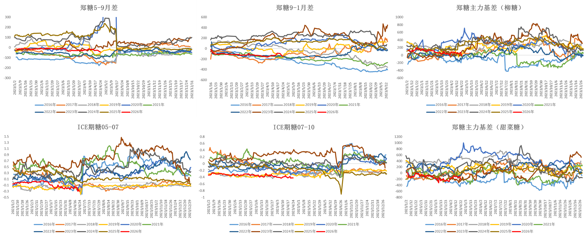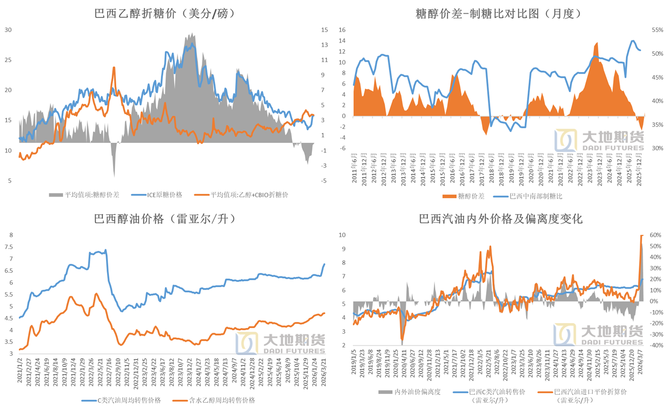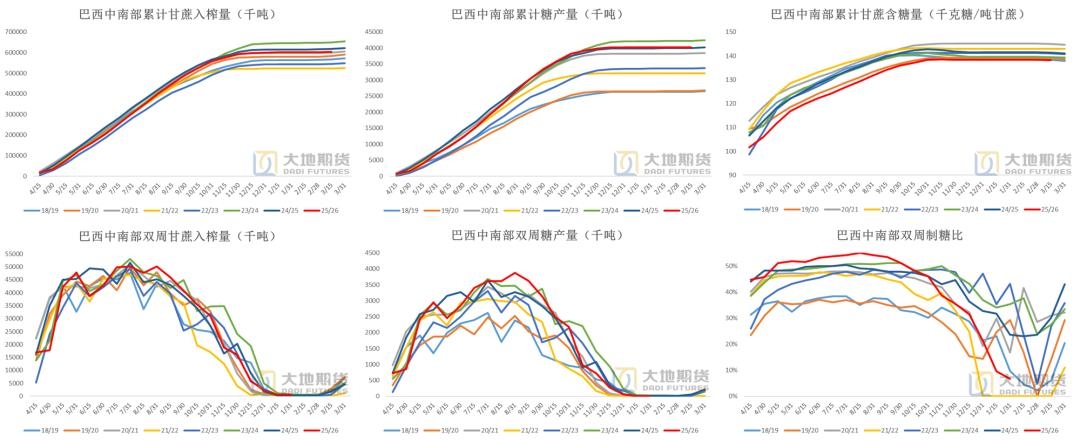 | 01 巴西:寻找合理的估值区间 巴西的糖醇过剩问题需要内部平衡 巴西新榨季存在甘蔗增产预期,同时巴西糖和乙醇都有过剩压力,因此重点在于评估制糖比的均衡点。Conab给出新一轮评估,中南部估产4078万吨,预期内。 2025年3月上半月,巴西中南部累计甘蔗入榨量6.04亿吨,同比-2.21%;累计产糖量4025万吨,同比+0.71%;累计产醇330亿升,同比-4.21%;累计制糖比50.61%,同期+2.5个百分点。双周糖产同比-4.7万吨;双周制糖比4.86%,同期-25.27个百分点。