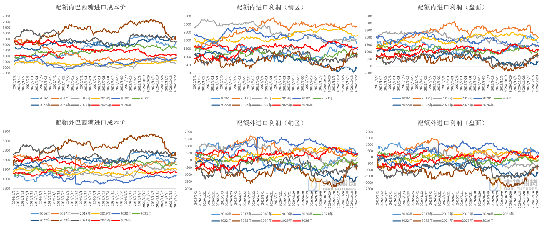 数据来源:糖协 沐甜科技 大地期货研究院 进口成本仍在5000元以下 原糖回落后,配额外进口成本持续处于5000元以内,内盘受部分题材炒作影响表现偏强,内外价差偏反套运行。 截至4月23日,配额外进口利润(盘面)476元/吨,配额内进口利润(销区)1703元/吨,配额外进口利润(销区)668元/吨。 目前配额内巴西糖进口成本约3902元/吨,配额外约4937元/吨。