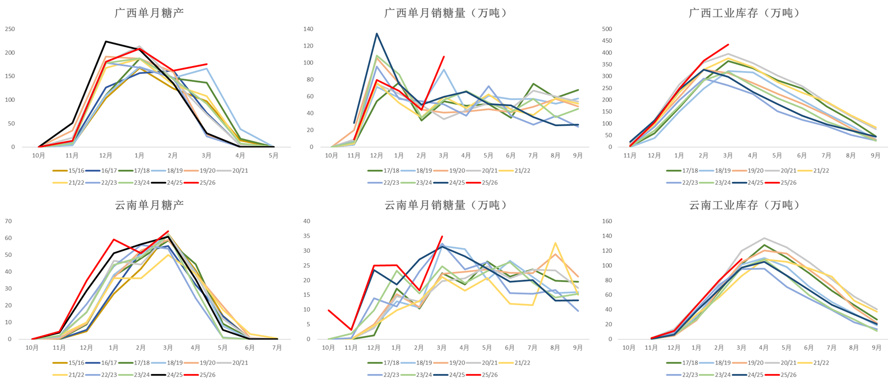 数据来源:Wind 泛糖科技 大地期货研究院 03 内盘政策再次炒作放大波动率 广西增产幅度较大 国内3月广西糖产数据很高,甘蔗产量及出糖率都高于预期,预计榨季末产量接近770万吨,同比增产约120万吨。 截至3月底,25/26榨季广西累计产糖741万吨,同比+95万吨,累计销糖307万吨,同比-41万吨,工业库存434万吨,同比+136万吨; 云南累计产糖149万吨,同比+9万吨,累计销糖70万吨,同比-2万吨,工业库存80万吨,同比+12万吨。