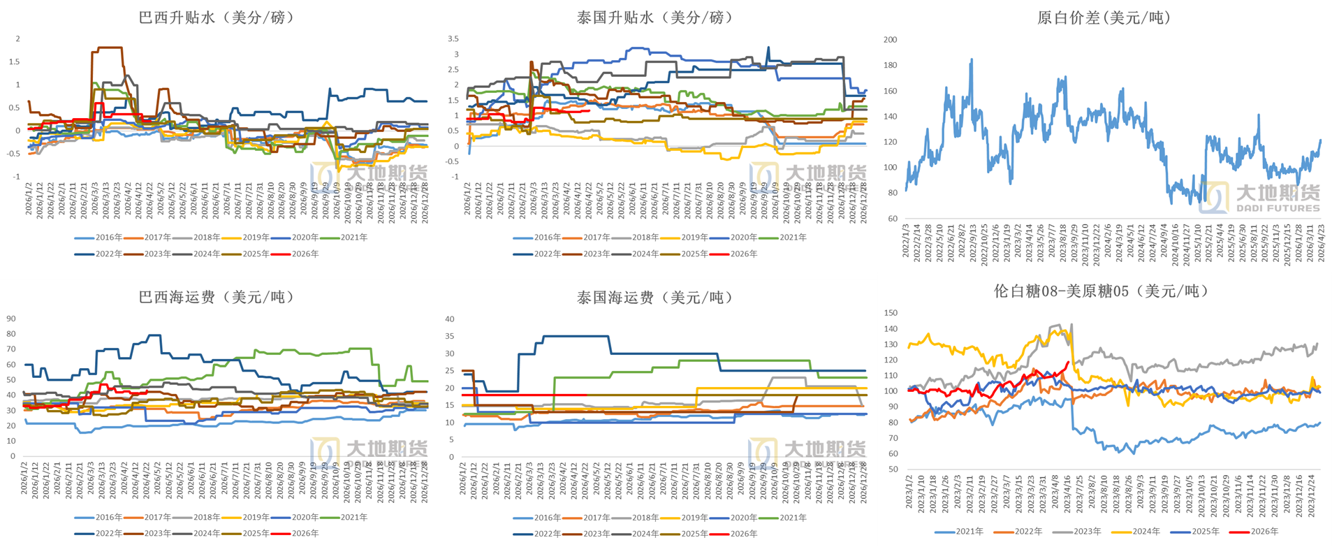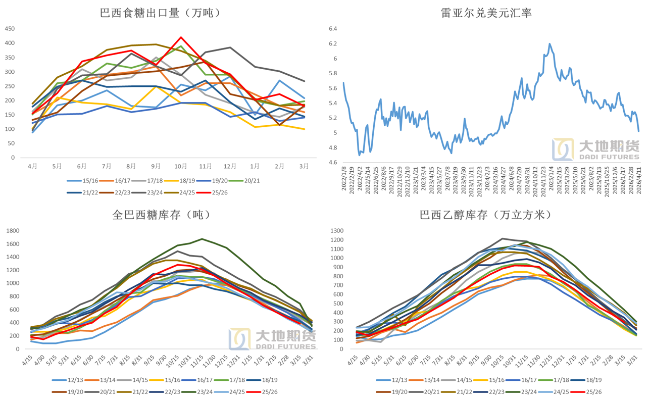 数据来源:Anp Unica Cepea 大地期货研究院 开榨后巴西糖出口能力再次回升 开榨后巴西糖库存和出口都会出现季节性回补。 2026年3月巴西食糖出口181万吨,同比-2.4%。 2026年4月前3周巴西食糖出口74万吨,较3月同期-33万吨。 截至2025年3月上半月,巴西食糖总库存387万吨,同比+19万吨;乙醇库存同比+15万立方米。
