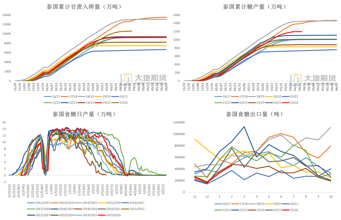 数据来源:印度海关 Chinimandi 泰国海关 大地期货研究院 泰国压榨表现较好泰国压榨表现较好,25/26榨季接近1200万吨的总糖产,同比增产185万吨。 截至2025年4月22日,泰国累计甘蔗产量1.057亿吨,同比+15%,产糖1198万吨,同比+19%。 2026年2月,泰国食糖出口46万吨,同比-39%。