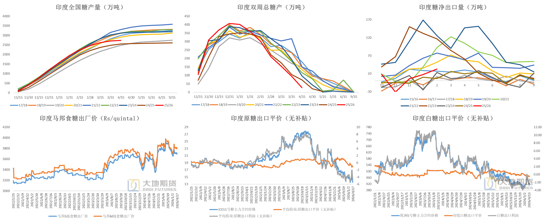 数据来源:巴西海关 路透 Cepea 大地期货研究院 02 北半球进入收榨期 印度压榨后期产量下滑较快 印度压榨表现偏差,按目前的产糖节奏本榨季糖产预期或还要小幅下调。 印度乙醇行业希望乙醇掺混率提高至20%以上,将不利于印度糖出口,同时国际油糖回落后印度白糖出口窗口关闭。 截至2025年4月15日,印度累计糖产2739万吨,同比+7%;双周糖产27万吨,同比-47万吨。 截至2025年4月17日,印度原糖出口平价约18美分/磅,白糖出口平价约468美元/吨,原糖、白糖均无出口利润。