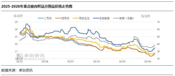 | 【导语】伴随着上游原料集中释放,需求增幅不及供应增幅,鲜品猪肉产能过剩,2026年4月上半月国内鲜品猪肉价格延续下降趋势。但因上游养殖端抗价惜售,屠宰企业收购难度增加,鲜品猪肉供应短时收紧,支撑下半月价格止跌反弹。5月供应依旧充裕,且需求好转程度有限,预计鲜品猪肉分割品价格或小跌后窄幅震荡,但同比或上涨。 1. 2026年4月份国产鲜品猪肉分割品价格先跌后涨 从图1看到,2026年2月中旬至4月上旬,国内鲜品二号肉、四号肉、带皮五花、去颈前排及肋排价格呈现持续下降的走势,且价格已跌至偏低水平;中旬开始,各产品价格陆续反弹,其中肉类价格涨幅明显。据卓创资讯统计,截至2026年4月27日,国内鲜品二号肉成交均价为15.95元/公斤,较月内低价累计上涨6.25%;鲜品四号肉成交均价为16.07元/公斤,较月内低价累计上涨6.64%;鲜品带皮五花成交均价为16.23元/公斤,较月内低价累计上涨1.67%;鲜品去颈前排成交均价为18.36元/公斤,较月内低价累计上涨8.21%;鲜品肋排成交均价为38.32元/公斤,较月内低价累计上涨8.61%。