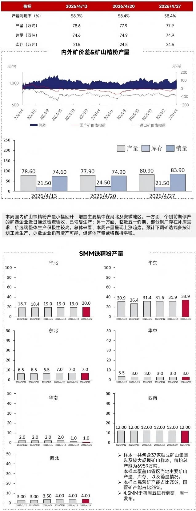 | 报告品种:铁矿石 原文链接:https://mp.weixin.qq.com/s/zx1xSqlPwawdh3-cngtsMQ 根据SMM最新统计数据,本周国内矿山整体产能利用率为60.6%,较上周上升2.2个百分点;铁精粉产量为80.9万吨,环比上升3万吨。与此同时,矿山精粉库存降低3万吨,当前维持在21.5万吨左右。 本周国内矿山铁精粉产量小幅回升,增量主要集中在河北及安徽地区。一方面,个别前期停产的矿选企业近日通过检查验收,已恢复生产;另一方面,临近五一假期,部分钢厂存在补库需求,矿选端整体生产积极性较高。总体来看,本周产量呈现上涨趋势。预计下周矿选端多按计划正常生产,少数企业仍有增产可能,但整体产量或将保持平稳。