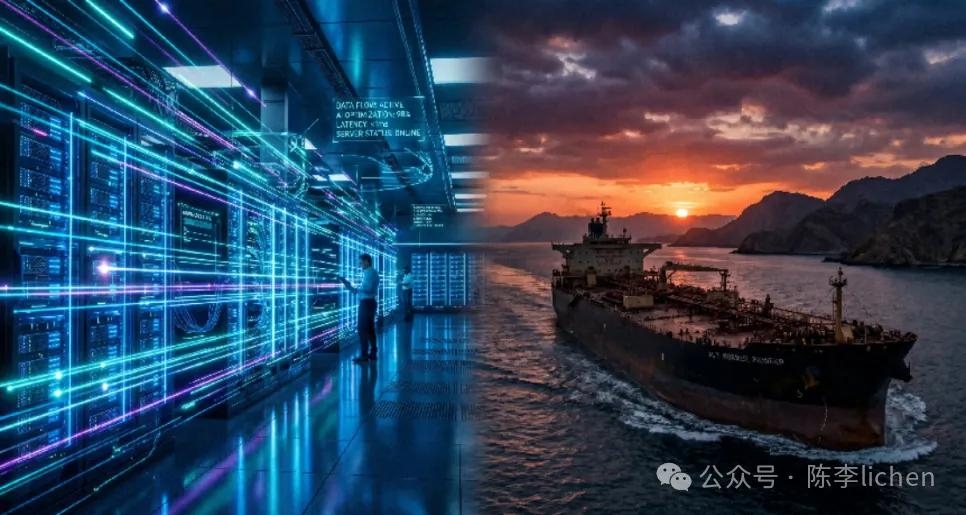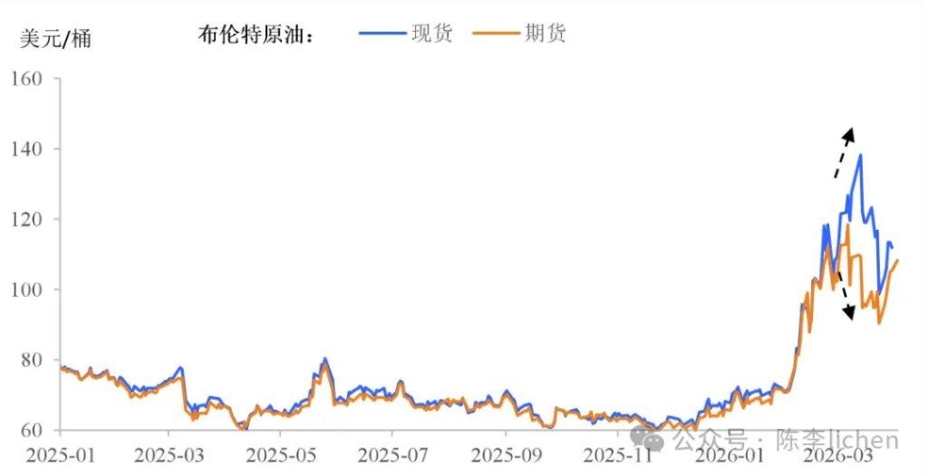 A股市场如是。AI算力和光通信行业的交易量占到整个A股市场的35%。市场每成交三块钱,就有一块钱是交易“光”。“易中天山”股价要么接近新高要么已然新高。 所以,站在光里的资本市场,不需要在意霍尔木兹了吗?不论伊朗战争如何演绎,AI产业链股票就这样持续上涨吗? 光和油有着自洽逻辑。为什么现在业界疯狂追求CPO(共封装光学)或 LPO(线性驱动可插拔光学)?“省电”之所以成为核心竞争力,正是因为全球能源中枢(石油与天然气)的不稳定性,使得算力的能源成本变成了决定胜负的边际变量。 技术路线的演进,本质上是对能源焦虑的一种技术性对冲。 但是,在原油现货价格没有回落的情况下,AI产业链公司股价持续上涨,正常吗?市场起伏,让我们天然的警觉。算力的指数级增长迟早会撞上能源的物理墙。能源的物理供应变动,也会像货币的流动性一样,影响甚至遮蔽“光”。 原油现货与期货的“剪刀差”,总有一个错了?! 目前原油市场出现了一个极其诡异的信号:现货价格显著高于期货价格。布伦特原油现货价格已经达到105美元,但12个月的期货价格仅仅是60-62美元。在过去一段时间,由于霍尔木兹海峡事实中断,全球原油的20%供应受到严重影响。现货价格快速上涨,布伦特突破130美元。但期货价格却相较稳定,甚至最低回到了90美元。 布伦特原油的期货和现货价格及其剪刀差▼
