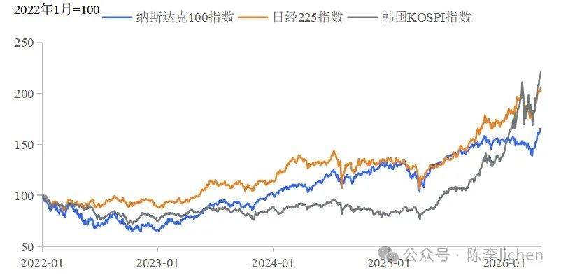| 关于伊朗形势的文章阅读量最近一个月大幅下降,全世界的股市站在光里,上演“光的狂欢”。从硅谷的算力巨头到苏州的制造工厂,光通信主题的股票涨势如虹,完全抹平了三月份伊朗局势动荡带来的裂痕。 全球股市最近都被 AI 产业链的寡头垄断 日本股市中,半导体相关股票贡献了日经指数上涨的 40%。仅仅爱德万(英伟达核心设备测试商)和东京电子两家企业贡献了市值上涨的20%。韩国股市更加夸张,三星电子和海力士,两家半导体巨头的市值占据了韩国 KOSPI 指数的40%。海力士一家企业就贡献了韩国KOSPI的30%涨幅。 纳斯达克、日经指数和韩国KOSPI创出历史新高▼