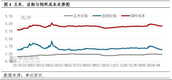 饲料原料价格稍跌,饲料成本降低。玉米方面,4月上旬产区基层余粮陆续进入收尾阶段,市场粮源逐步向贸易环节集中。受3月下旬价格回调影响,部分贸易商心态动摇,加上华北地区玉米库存水分偏高、麦收前腾库需求迫切,4月份贸易环节或陆续适量出货,市场供应将相对宽松,价格稍显弱势。豆粕方面,3月下半月以来,豆粕现货价格自近13个月高点下滑,供需基本面现实及预期支撑不足、宏观升水消退共同主导这波顺畅跌势。截至4月23日,全国43%蛋白豆粕现货均价为2953元/吨,自3月中旬的年内高点3420元/吨下降467元/吨。市场缺乏交易题材,基本面的弱势使得市场情绪持续低迷,中上游积极出货,下游减持头寸,现货成交活跃度较低,施压豆粕现货价格回调。综合玉米、豆粕价格,截至23日单斤鸡蛋饲料成本下调至3.05元,较月初跌幅2.24%。