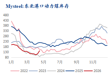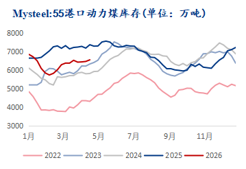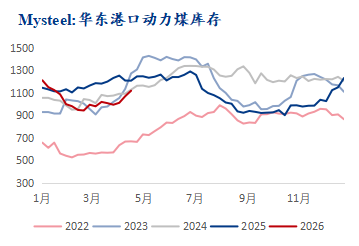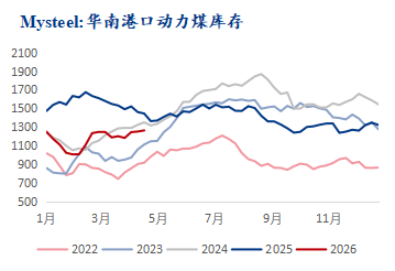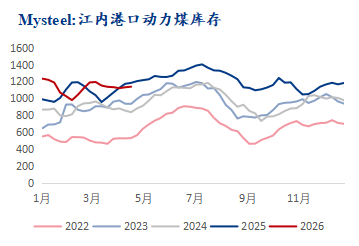 数据来源:钢联数据 江内区域:上周港口库存小幅上涨,港口库存1138.5万吨,周环比增加7万吨。贸易商情绪看涨,发运稍有增加,价格坚挺,但区域内新能源出力较好,火电日耗较低,需求受到抑制,终端维持长协拉运,少量询货压价为主,市场煤采购节奏偏缓,实际成交表现较弱。