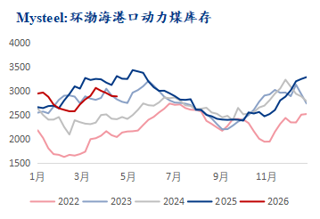 数据来源:钢联数据 环渤海区域:上周港口呈持续小幅去库态势,港口库存2880万吨,周环比减少9吨。现阶段大秦线春检进入尾声,多数贸易商情绪向好报价坚挺,低硫优质煤种报价偏高。但下游以长协履约为主,终端需求释放不佳,少量询货压价现象仍存,整体市场实际成交较少,谨慎操作观望为主。