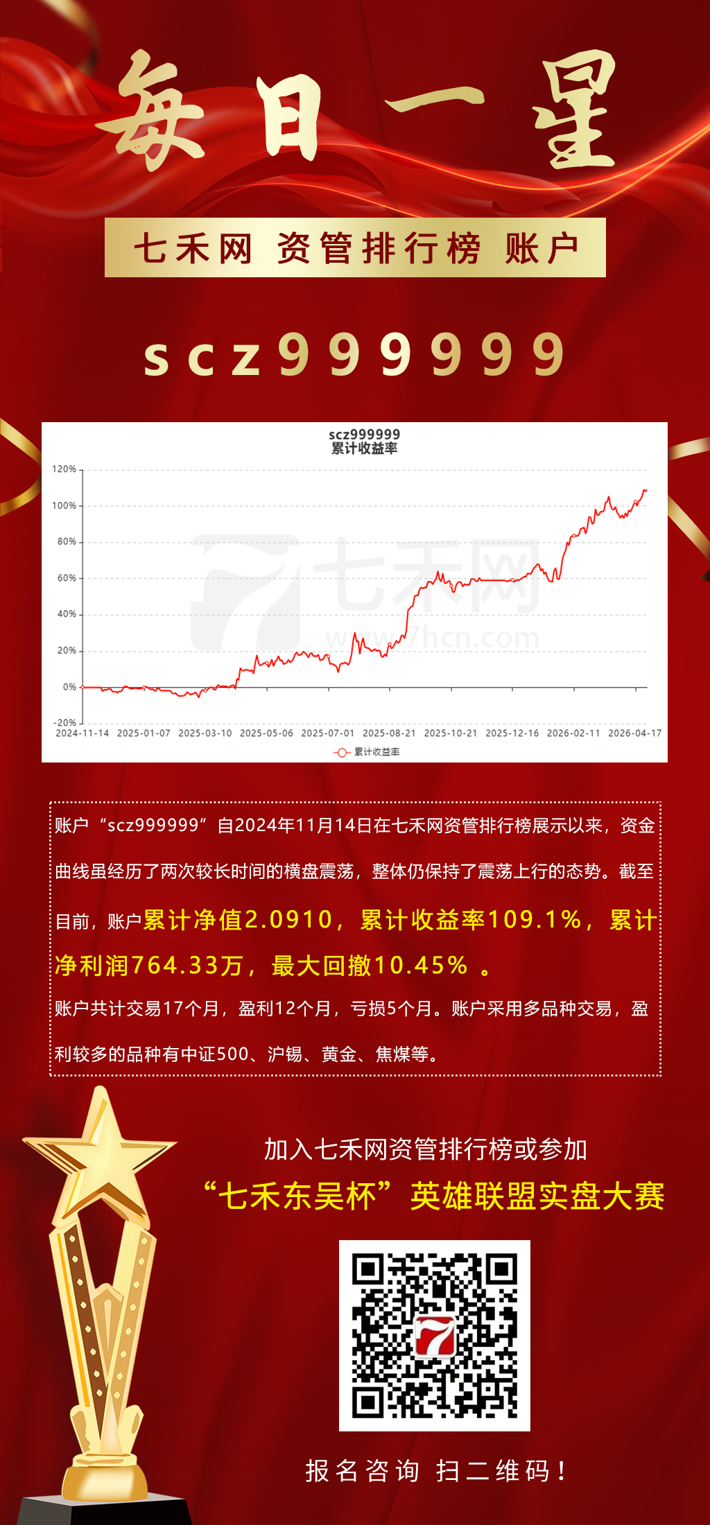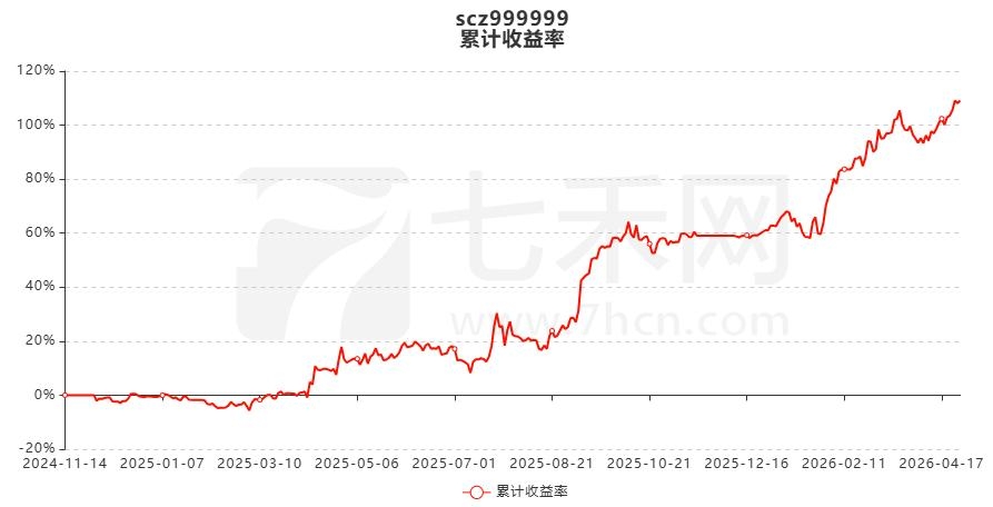 账户“scz999999”自2024年11月14日在七禾网资管排行榜展示以来,资金曲线虽经历了两次较长时间的横盘震荡,整体仍保持了震荡上行的态势。截至目前,账户累计净值2.0910,累计收益率109.1%,累计净利润764.33万,最大回撤10.45% 。