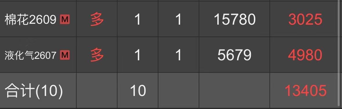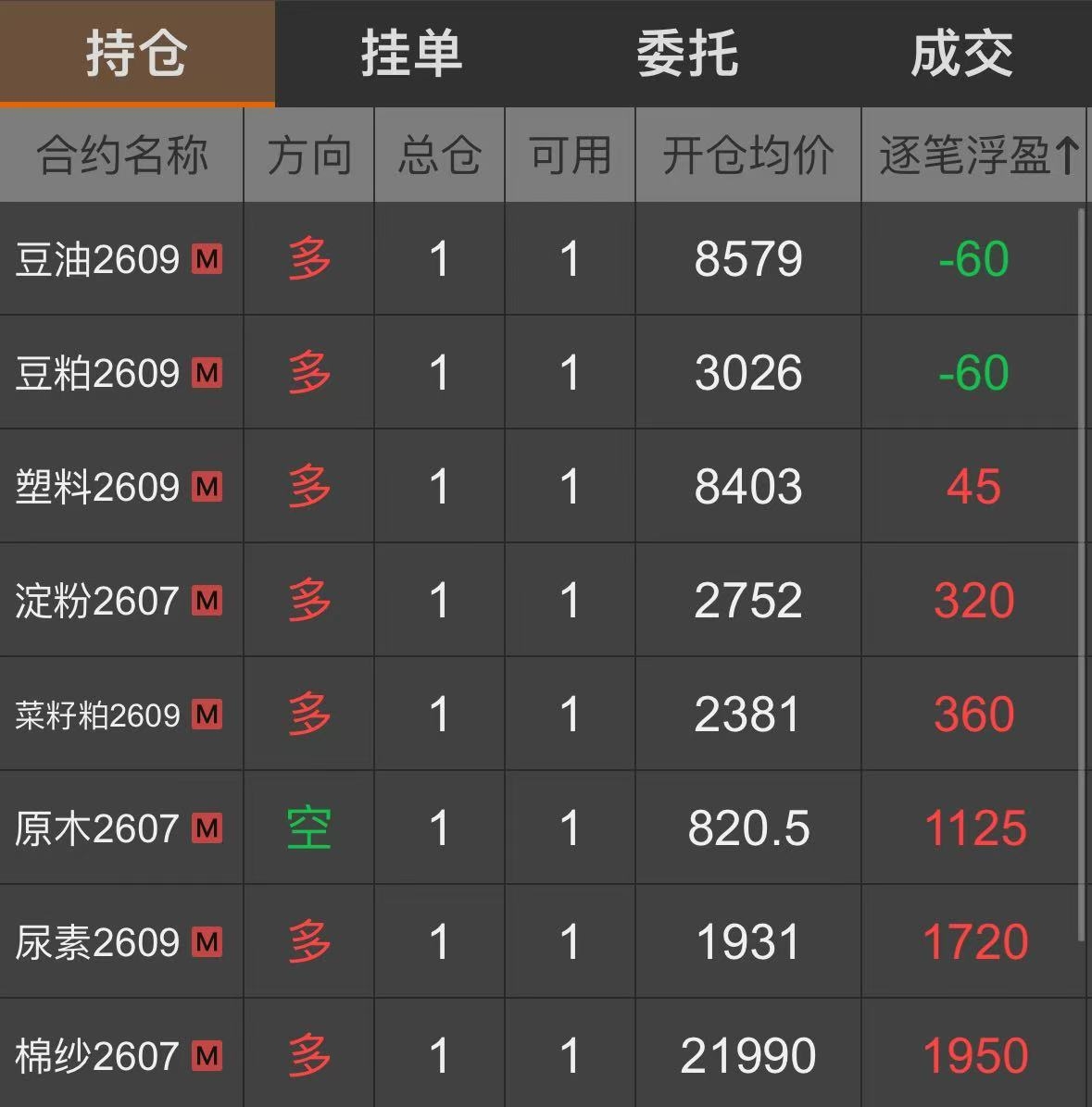 | 一、开仓总结 棉纱:2026年4月8日,达到启动点的开仓条件,所以在14:48开多一手棉纱2605合约,开仓价为21575。棉纱2605合约于2026年4月10日09:51移仓至主力合约2607,开仓价为21990。 淀粉:2026年4月9日,达到启动点的开仓条件,所以在14:44开多一手淀粉2605合约,开仓价为2760。淀粉2605合约于2026年4月15日21:14移仓至主力合约2607,开仓价为2752。 棉花:2026年4月10日,达到启动点的开仓条件,所以在14:45开多一手棉花2609合约,开仓价为15780。 尿素:2026年4月20日,达到启动点的开仓条件,所以在14:49开多一手尿素2609合约,开仓价为1931。 豆粕:2026年4月22日,达到启动点的开仓条件,所以在14:41开多一手豆粕2609合约,开仓价为3026。 原木:2026年4月23日,达到启动点的开仓条件,所以在14:54开空一手原木2607合约,开仓价为820.5。 菜粕:2026年4月23日,达到启动点的开仓条件,所以在14:59开多一手菜粕2609合约,开仓价为2381。 液化气:2026年4月27日,达到启动点的开仓条件,所以在14:33开多一手液化气2607合约,开仓价为5679。 塑料:2026年4月29日,达到启动点的开仓条件,所以在14:33开多一手塑料2609合约,开仓价为8403。