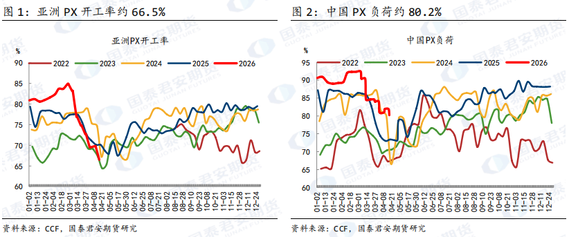 | 报告品种:PX、PTA、短纤、瓶片 原文链接:https://mp.weixin.qq.com/s/EjKpm0u2hLv84i0N-AT5Bg 报告导读: 本次调研于2026年4月14日至17日,先后前往上海、江阴、仪征、青岛、东营等地,对PX、PTA、聚酯等加工和贸易环节重点企业开展实地走访与深度交流,深入华东市场摸清聚酯产业链各环节工厂运营近况。调研核心背景为伊以冲突引发原油价格大幅波动及供应中断风险,该影响自上而下传导至聚酯产业链各环节,导致各环节开工率、市场需求、加工费等出现明显异动,同时叠加霍尔木兹海峡通行受阻带来的物流影响,进一步加剧产业链波动。 PX环节:原料缺口引发工厂降负潮,预计5-6月工厂检修减量集中爆发,华南地区降负最为显著,配套炼化一体化企业原料供应相对稳定。进口方面,海外炼厂受原料短缺影响执行不可抗力,4月PX进口量预计明显缩窄,后续供应压力持续加大。 PTA环节:加工费是决定工厂开工率的核心因素,新旧装置成本差异明显,旧装置受加工费压力易提前停车。受益于东南亚能源紧缺、欧美订单转移,今年PTA出口表现较优,有望成为需求亮点。 短纤环节:短纤协会达成统一减产10%的共识,预计4-5月陆续执行,但企业普遍认为减产力度不足,行业负荷高位进一步制约加工费修复。下游纱厂持观望态度,低价库存即将耗尽,叠加粘胶、仿大化等替代品冲击,需求短期承压,关注下游补库时机。 瓶片环节:表现相对稳健,工厂以提升利润为核心目标,通过联合降负维持合理加工费。下游国内饮料消费旺季带动需求,出口订单旺盛,不同工厂采取差异化出口策略。 总结: 品种间强弱:PX>瓶片>PTA>短纤。PX最强,作为聚酯上游,亚洲装置集中检修,进口预计缩量,供给收缩支撑PX二季度趋势偏强。瓶片次强,下游季节性旺季,叠加外贸溢价下的出口增量,工厂维持低开工,保障稳健加工费。PTA供需双弱,库存高位,边际装置降负,关注5月去库表现。短纤开工仍处同期高位,下游工厂观望且替代品挤占需求,加工费持续承压,为产业链内相对较弱的品种。 PTA去库拐点是核心,关注多PX空PTA套利操作。PX供需紧平衡强于PTA,PX检修持续去库,PTA库存拐点未完全确认,近端仓单压力压制上行空间。考虑多瓶片空短纤套利。瓶片供需与利润显著优于短纤。瓶片库存低位,出口向好。短纤需求疲弱、开工偏高,加工差持续压缩。 风险:地缘存在降温预期但美伊谈判消息反复。关注PTA超预期去库、PX装置重启带来的价差收敛风险。警惕纺织订单集中回暖,带动短纤阶段性补库反弹。 一、调研背景与概述 2026年4月14日至17日,先后前往上海、江阴、仪征、青岛、东营等地,对PX、PTA、聚酯等加工和贸易环节的重点企业进行了实地走访与深度交流。 本次调研深入华东市场,切实了解聚酯产业链中各环节的工厂近况。伊以冲突带来原油价格大幅波动与供应中断风险,自上而下传导至聚酯产业链的各个环节,引发了开工、需求、加工费等多方面的异动。 二、PX:二季度预计供应减量明显 1、地缘扰动下,原油供给偏紧,亚洲炼厂集体降负 工厂因货源不同降负表现不一。北方炼厂多用俄罗斯进口原油,南方炼厂多用中东货源。本轮冲突影响下,华南PX工厂最先受到冲击,供需最为紧张。福建多家PX工厂开工负荷降低:福建某炼厂主要原料来自伊拉克,开工不到四成。另有炼厂约半数原料来自伊朗,开工六七成。而大连某炼厂由于石脑油主要来源为俄罗斯和山东,满负荷开机。本次调研中,配套炼化一体化的PX生产企业,一般原料缺口较小,多采用内部自供方式,甚至有盈余部分外售。 受中东地区物流影响,原料缺口引发的工厂降负潮预计在5-6月爆发,检修减量预计可达每月120万吨以上。华东地区,某炼厂60万吨装置4月中旬起检修一个半月,某炼厂89万吨检修提前至5月。浙江某炼厂2-4月降负约15%。山东某炼厂3月底-5月初计划检修42天,海外母公司石脑油供应偏紧。另有华东某工厂160万吨装置计划5月起停车,对市场冲击较大。