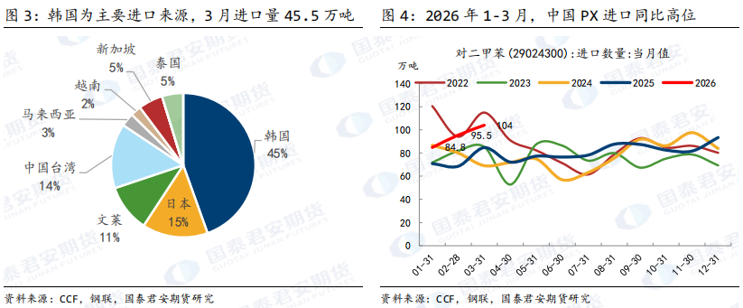 2、PX进口4月中旬到港缩量明显,现货紧缺 海外检修带来的进口量缩减,预计于二季度体现。2026年1-3月,中国PX进口同比高位。3月中国大陆PX进口量104万吨,环比增加8.9%,同比增长22.9%。4月上旬和3月持平,每周20-25万吨的进口量。11-12日起,到港有明显减少,月度总量预计同比少于3月。