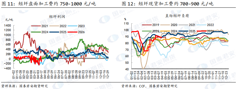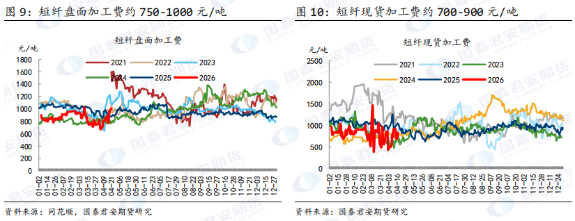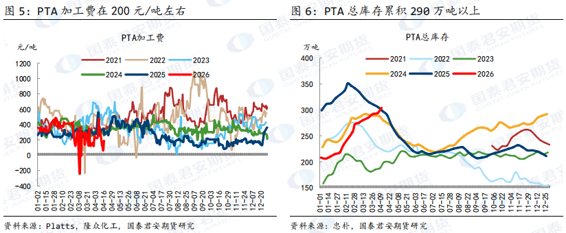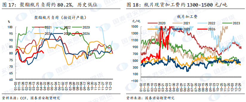 六、总结 品种间强弱:PX>瓶片>PTA>短纤。PX最强,作为聚酯上游,亚洲装置集中检修,进口预计缩量,供给收缩支撑PX二季度趋势偏强。瓶片次强,下游季节性旺季,叠加外贸溢价下的出口增量,工厂维持低开工,保障稳健加工费。PTA供需双弱,库存高位,边际装置降负,关注5月去库表现。短纤开工仍处同期高位,下游工厂观望且替代品挤占需求,加工费持续承压,为产业链内相对较弱的品种。 PTA去库拐点是核心,关注多PX空PTA套利操作。PX供需紧平衡强于PTA,PX检修持续去库,PTA库存拐点未完全确认,近端仓单压力压制上行空间。考虑多瓶片空短纤套利。瓶片供需与利润显著优于短纤。瓶片库存低位,出口向好。短纤需求疲弱、开工偏高,加工差持续压缩。 风险:地缘存在降温预期但美伊谈判消息反复。关注PTA超预期去库、PX装置重启带来的价差收敛风险。警惕纺织订单集中回暖,带动短纤阶段性补库反弹。 七、调研情况记录 1、华东某PXPTA生产企业A 产能:PX产能400万吨/年。PTA产能2条250万吨/年,合计500万吨/年。MEG一条90万吨/年,一条100万吨/年,合计190万吨/年。推迟投产2条25万吨聚酯新项目,目前处于试运投阶段。 开工:PX满开,PTA两条线满开,MEG开一条。预计6月底检修。 原料采购:采购原油、MX,整体不缺原料。石脑油由企业自身的炼化一体化采购原油炼化自供,供应充足,甚至有小部分盈余外售。由于当前MX内外盘倒挂,价差1000+元/吨,因此采购山东内盘货为主。 原料备货:原油备货到5月底,近期有高价采购巴西油,供应不缺但价格偏贵。 下游订单:PTA主要供给苏北客户。当前下游小客户开工一般,大客户开工好于预期。上周初油价上涨,尾盘产销200%。 库存:库容不大,PX由管道直接送到PTA工厂,多余部分船运给下游客户。 套保方式:PX以纸货套保为主,TA通过期货套保为主。 市场预期:PX和PTA整体基本面情况为“现实差,预期好”。现实方面,高仓单、高库存、高库销比,对近月的想象力弹性不强,因此跟涨原油不及时。预期方面,日韩、中国台湾等多地工厂发布不可抗力,但目前还未有很明显的减量。PTA工厂无追买。 2、华东某短纤生产企业B 产能:短纤产能50万吨/年,包括缝纫线6万吨/年、常规短纤10万吨/年和水刺30+万吨/年。日产约1400吨。 开工:满负荷开工。由于订单计划已排满且原料已锁定,因此4月暂无减产计划,计划5月中下旬减产。常规检修周期为2.5年-3年大修,单次1个月,日常小修为1周。 销售:70-80%为长协,基本满产满销。客户分布在江西、山东、湖北、河北、河南等地,出口占比约1/3。 原料采购:PTA基本为满合约采购。主要使用集装箱运输,节省人工与抛洒料,部分采用槽车。采购模式为第四代交易结算模式,采用后点价模式降低成本。乙二醇全部购现货,具备地理上的天然优势,可直接从港口购货。 原料备货:以产定采,库存备3-4天量即可。货源供应稳定,大风大雾等特殊天气情况影响不超过1天。PTA采购按合约执行,每月底确认下一个月的量。采购量基本稳定,今年下半年与去年及今年上半年比相差不大。若下个月检修,需提前告知供应商减少拿货量。多余原料优先转售贸易商抛盘,以快速回笼资金。 库存:目标实现零库存,甚至负库存。 下游订单:再生短纤挤压部分下游订单。 市场预期:PTA最近受宏观影响更大,仓单累积高位,目前加工费两位数,工厂开工动力不足。且PTA工厂开工受上游原料制约明显,PX5月多检修,供需偏紧。预计至少上半年PTA向下空间不大。乙二醇短时间内偏弱,目前港口库存量过高,上周至本周的进口量急剧减少。中东局势传导具有滞后性,4月目前霍尔木兹海峡尚未开通,预计5月到港量减量,可能影响持续至6月。煤制乙二醇开工提升有限。 3、华东某聚酯生产企业C 产能:PTA产能560万吨/年,聚酯瓶片460万吨/年,涤纶化纤80万吨/年。 开工:春节至今短纤产能仅开约60%,日产1600吨,近期涤纶短纤日度产销数据集中在40%-70%。 销售:短纤长协占50%,因产能不足,4月合约主动与客户沟通减少一半订单量;零售占50%。瓶片目前长约比例不高,强制高低配销售,以现货销售为主,零售一口价。以发货收款,定金制,付一车提一车,偏好现款。出口与内销比例约为1:1,5月份的订单已经排满。当前策略为惜售,还有余货,优先满足高价订单。 下游订单:短纤下游高价不采购或是少量采购,高价位订单一单一谈。预计后续瓶片下游需求仍有空间,海外需求有增量,且国内大厂仍有补库需求。 库存:短纤库存约5天,产销平衡为主。瓶片一般零库存,目前刻意控制少量库存,零库存风险过大。 加工费:企业希望保加工费,但实际成交与市场价格相差较大。目前短纤加工费约800-900元,企业认为至少要达到950-1000元(包含水电气人工)才能保本。瓶片加工费可达1500元,出口最高可达2000+元。 市场预期:PX二季度减产,5-6月份有大幅上涨可能。预计9月前瓶片加工费不会降低,后续原料供应偏紧,瓶片可能继续降负荷,且四月是下游传统旺季。 4、华东某PTA贸易公司D 销售:合约货作基础流转,一个月的量,占30%左右,其余为现货。以华东江浙为主,全国范围布局,一年PTA约300-400万吨。 市场预期:PTA仓单一直在生成,目前问题在05合约怎么处理多头的仓单。中东谈判的好坏直接影响未来上游的供应,PTA的月差将会出现截然相反的变化,目前期货仓单大概100万吨,如果基差想大幅走强,首先下游需要有良性的需求和持续性仓单流出