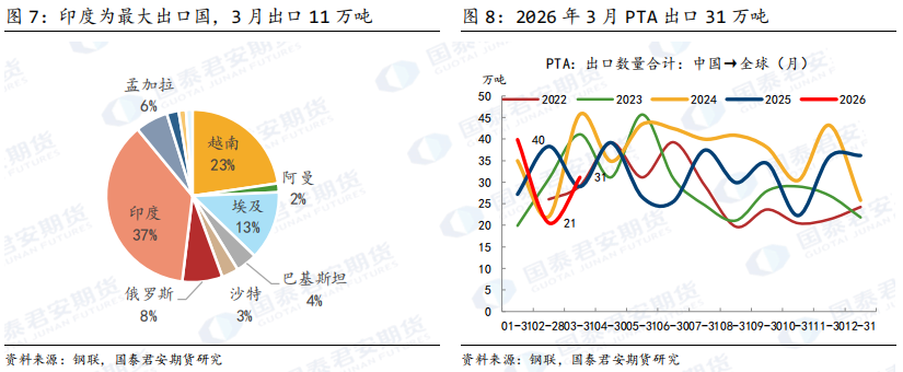 上游PX工厂检修降负的趋势下,PTA工厂表现较为平静,未表现出原料补货趋势。PTA加工费低位,多家工厂选择降负荷约30%。当前PTA库存累积高位,需要重点关注PTA库存拐点。 2、出口增加是需求端亮点 由于东南亚受冲突影响能源紧缺,叠加印度赖单,欧美大单向中国市场转移。虽受运费、船期影响可能延后,但中国对亚洲地区的船运状况稳定,今年PTA出口好于去年下半年。中国供应链完善且成本低,冲突后可能刺激产业链从东南亚回流中国,出口增量有较大的想象空间。