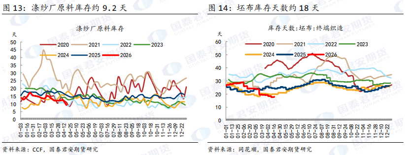 2、价格波动剧烈,下游谨慎观望,库存将见底 下游企业对高价采购持谨慎态度。价格波动大时,下游企业难以采购和接单,影响生产经营。目前纱厂备的低价货多在3月底用完,抗风险能力强的纱厂预计4月底卖完低价库存。纱厂普遍处于观望状态,本身负债高或有贷款房租的工厂较难支撑。坯布库存预计将消耗殆尽,后续接单意愿较低。