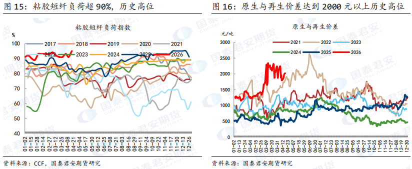 3、替代品挤占短纤订单需求 粘胶、莱赛尔、仿大化(再生)等产品用量有所上升,对短纤市场产生一定影响。目前仿大化价格约6500元,与大化差价超过2000元,影响短纤需求。3月下旬开始,江苏地区部分纱厂存在多用再生料的情况。