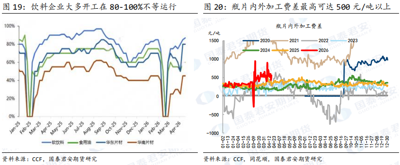 2、国内消费旺季需求,出口外贸订单火爆 下游国内消费旺季。饮料厂生产订单较多,尤其水饮料需求较好,工厂库存不高。 出口方面,外贸订单较好。受中东影响,海外瓶片供应非常紧张,越南工厂库存基本消耗完毕。海外价格高企,越南与国内瓶片价差可达约300元。不同工厂出口策略存在差异,部分工厂选择惜售,只接高价订单。部分工厂选择全发外贸订单,内贸现货已售空。